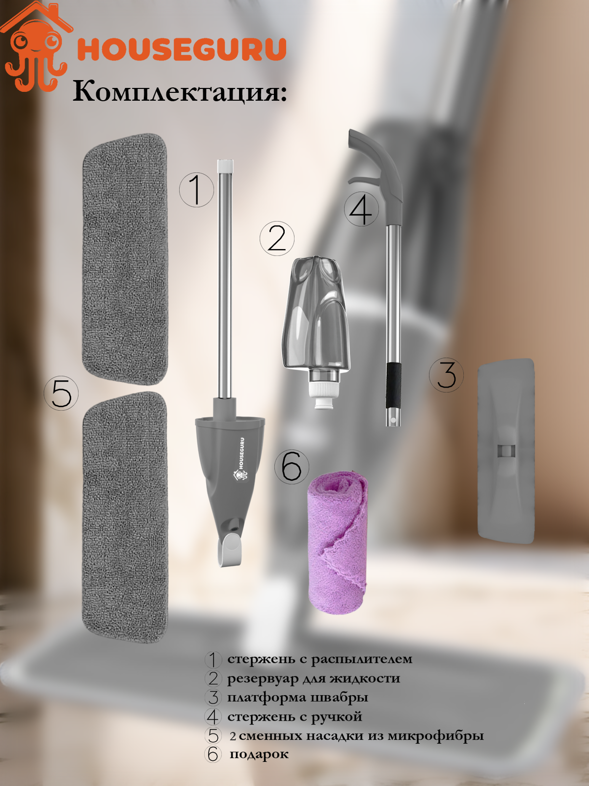 Швабра HOUSEGURU серая с распылителем, 2 насадки из микрофирбы, салфетка интересное: