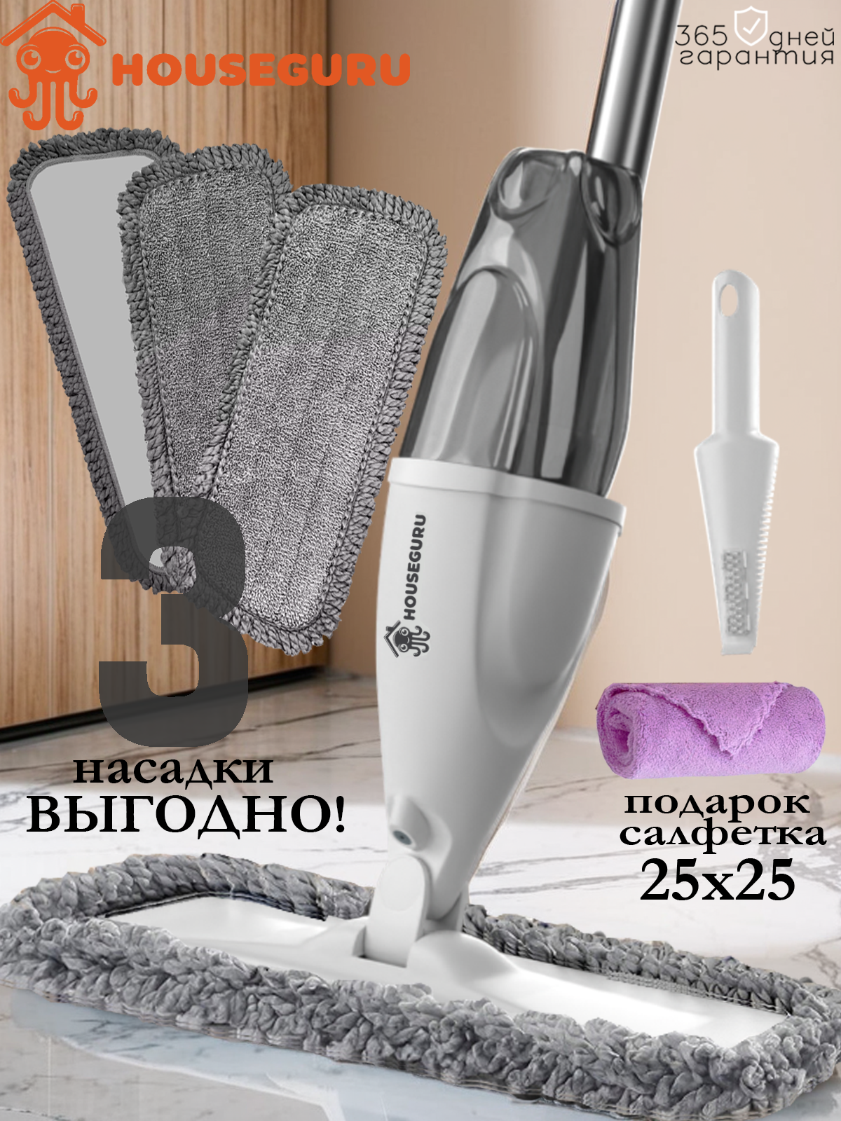 Швабра HOUSEGURU белая с распылителем, 3 насадки из микрофирбы, скребок, салфетка интересное: