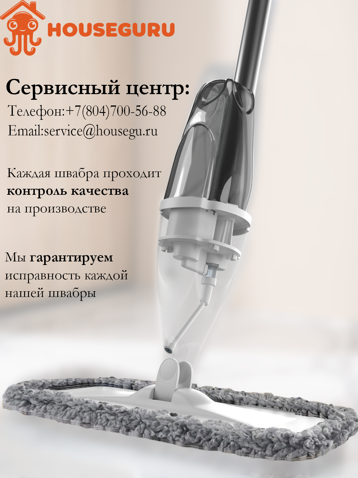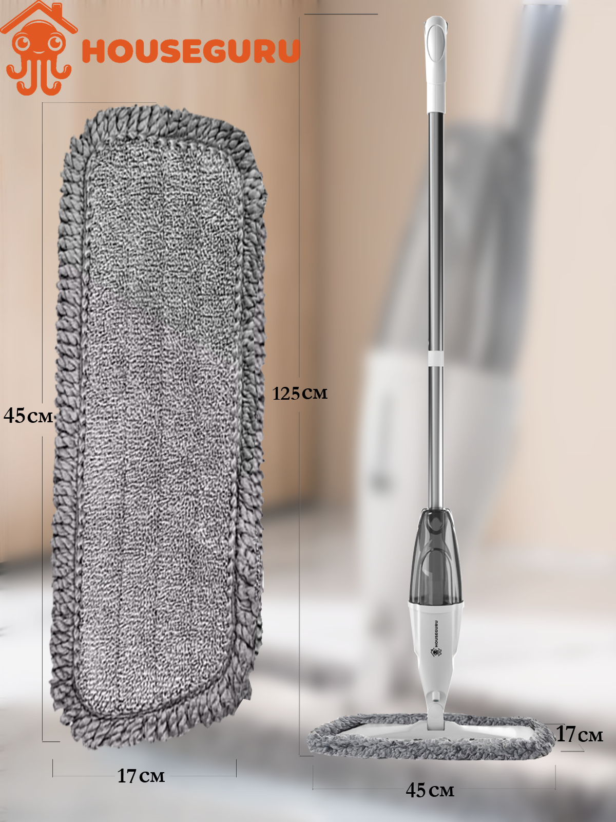 Швабра HOUSEGURU бежевая с распылителем, 2 насадки из микрофирбы, скребок, салфетка