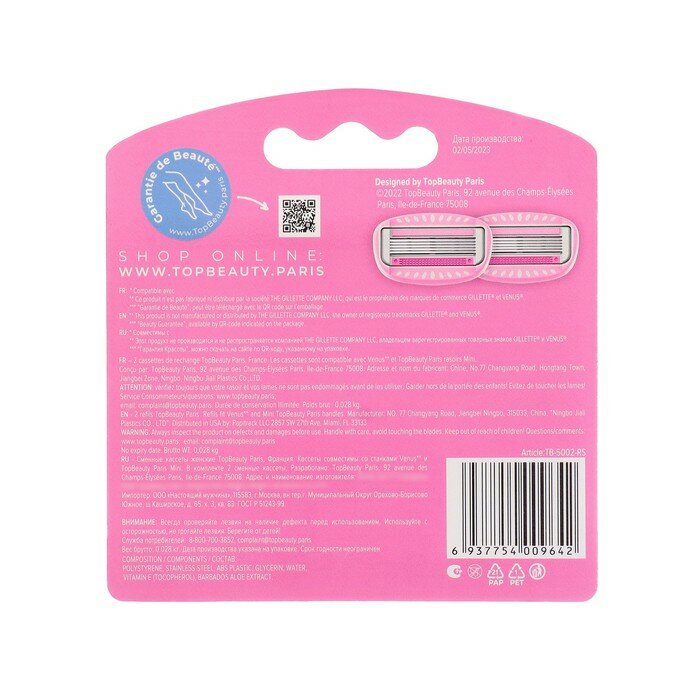 Сменные кассеты TopBeauty Paris, 5 лезвий. Совместимы с Gillette Venus. 2 шт.
