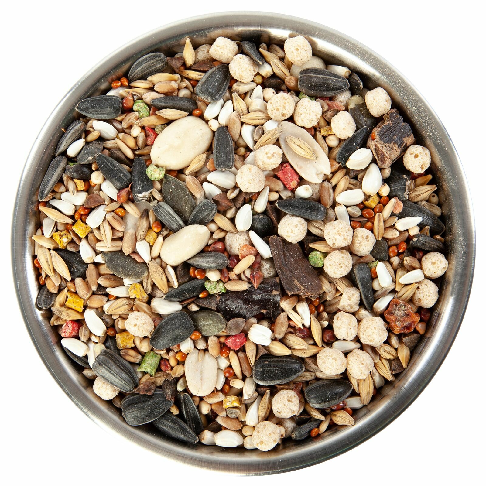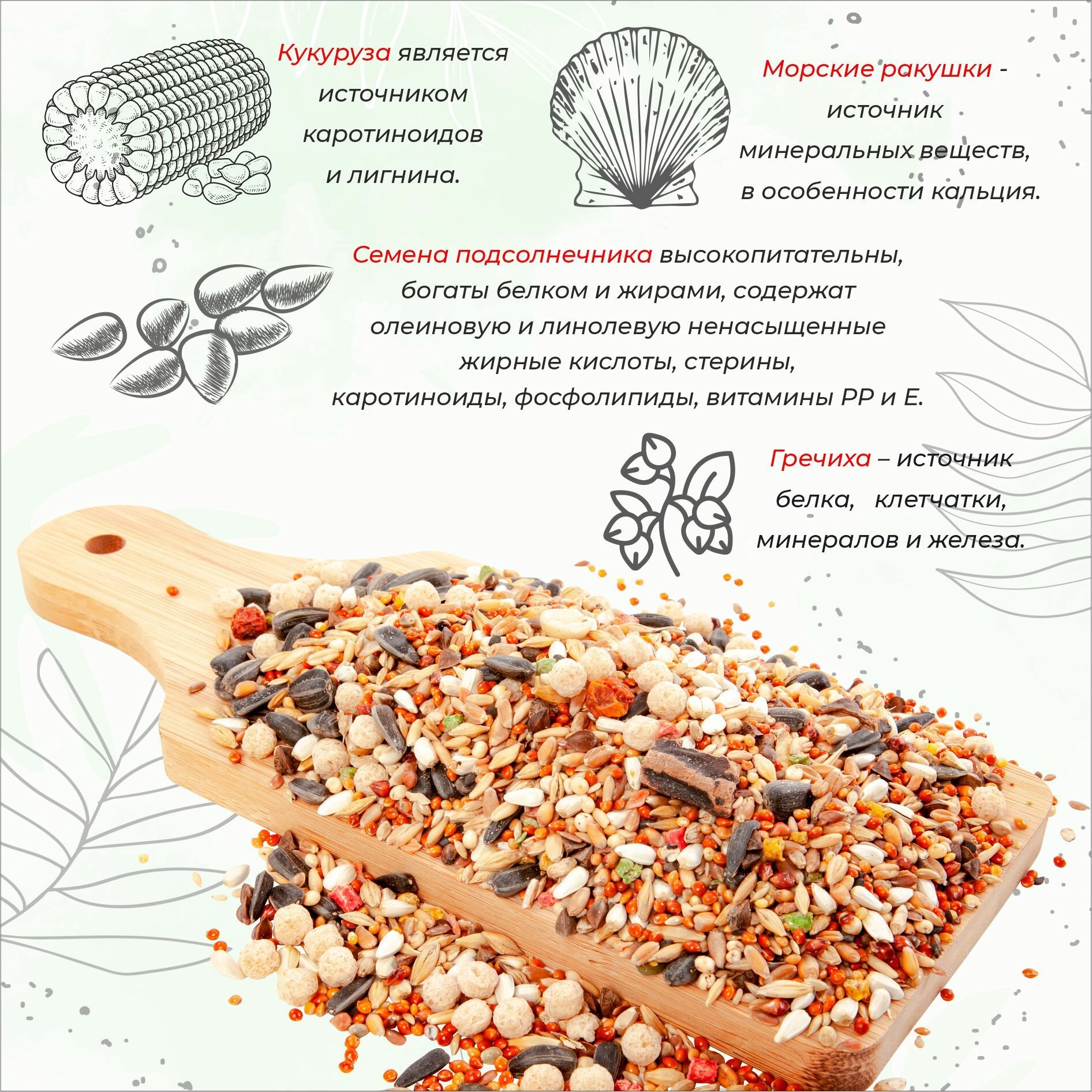| Состав | семена злаковых культур, просо, сафлор, овсяная крупа, семена конопли, семена подсолнечника, канареечное семя, сорго, гречиха, кукурузная мука, пшеничная мука, арахис, семена льна, плоды рожкового дерева, семена тыквы, рябина, семена травянистых растений, морковь, ракушка морская. |