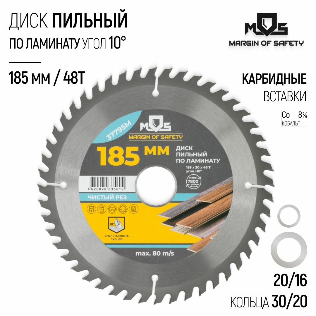 СохранитьДиск пильный по ламинату 185 х 30 х 48T + 2 кольца: 30/20 и 20/16 мм зубья твердосплавные ВК8 карбид вольфрама угол 10 для циркулярной пилы интересное: