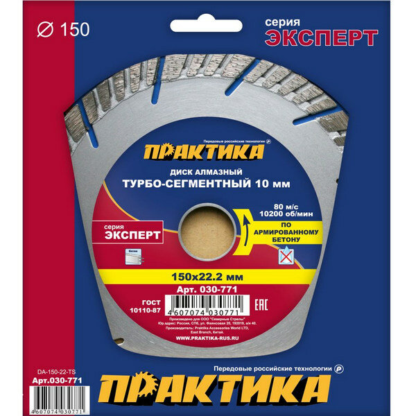 Диск алмазный турбосегментный ПРАКТИКА "Эксперт-бетон" 150 х 22 мм, сегмент 10мм (1 шт.) коробка (150х22мм, 10мм, коробка)
