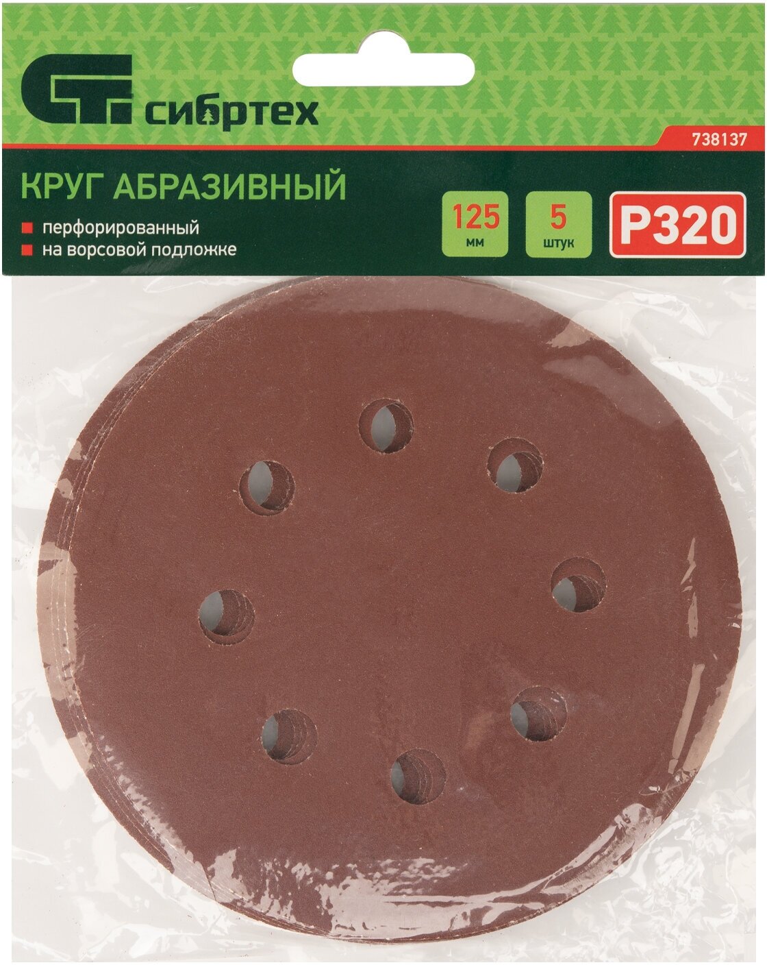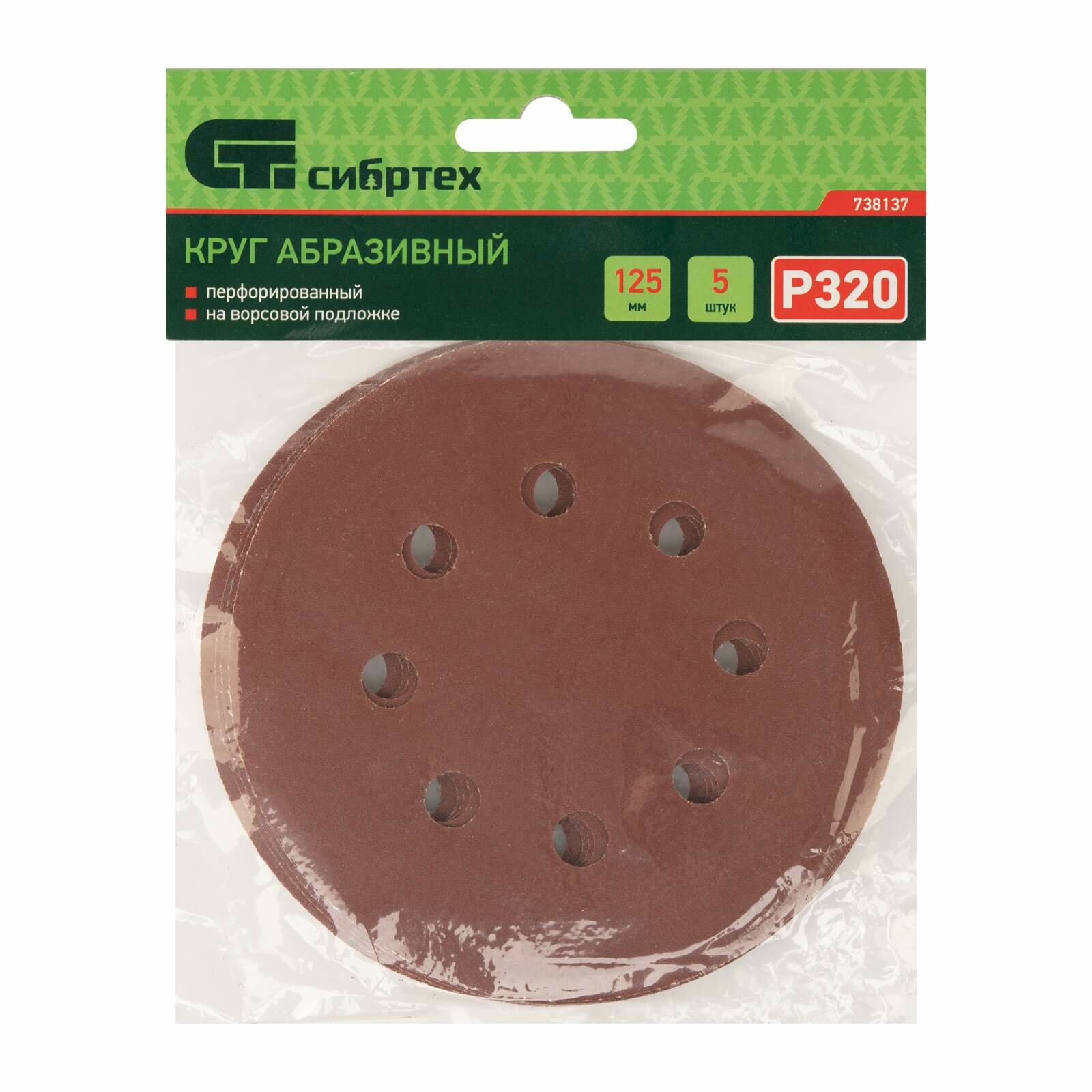 Купить Круг абразивный на ворсовой подложке под "липучку", перфорированный, P 320, 125 мм, 5 шт Сибртех, 738137