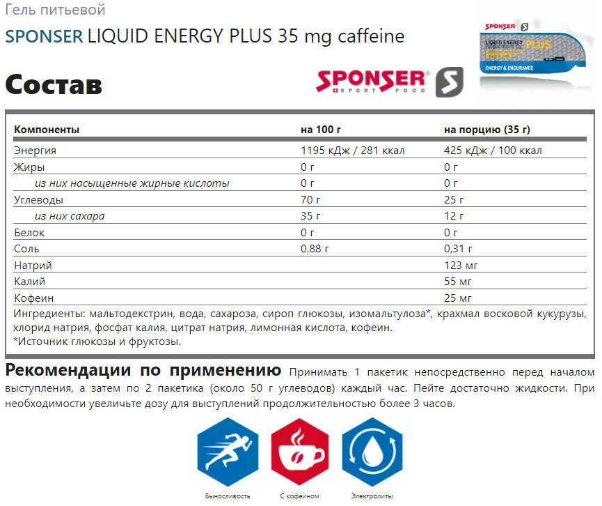 Ниже Вы можете прочитать отзывы на Гель питьевой SPONSER LIQUID ENERGY PLUS 25 mg caffeine 5 саше x 35 г, Натуральный, ознакомится с подробными характеристиками, посмотреть интересные обзоры и фотографии на Гель питьевой SPONSER LIQUID ENERGY PLUS 25 mg caffeine 5 саше x 35 г, Натуральный.