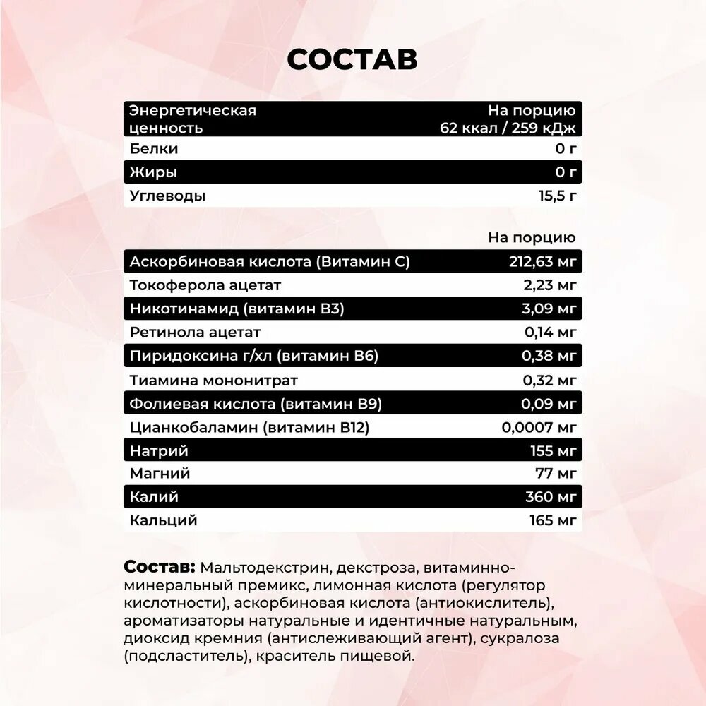 | Дополнительная информация | В качестве дополнения к основному рациону. Смешайте 20 грамм (2 мерных ложки с горкой) напитка с 500-600 мл воды. Пейте небольшими глотками (по 2-3) перед тренировкой (на разминке), во время тренировки и после нее, не дожидаясь наступления жажды. |