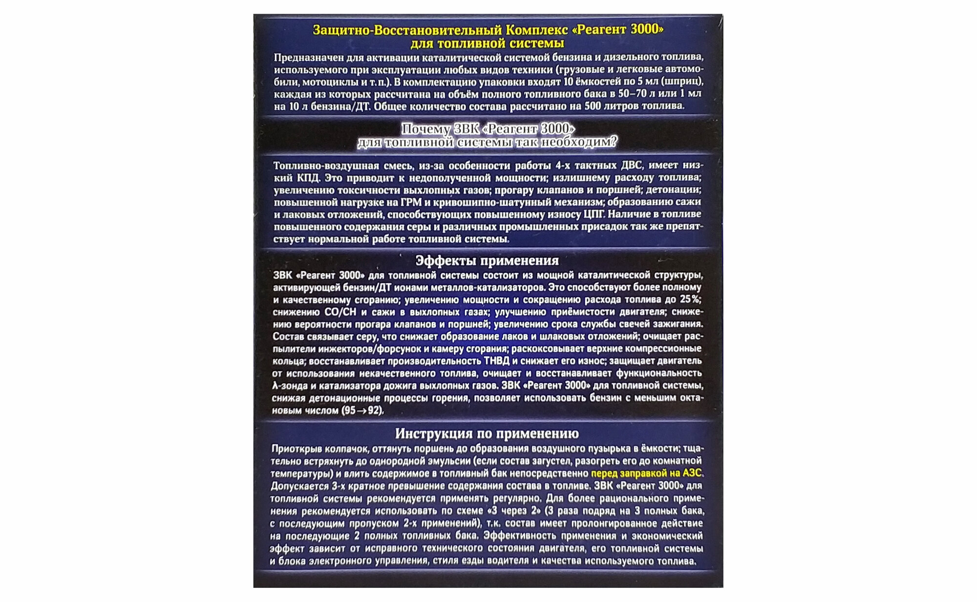 | Дополнительная информация | Эффект от применения ЗВК «Реагент 3000» «TRUCK» наступает через 500-2000 км и сохраняется, при условии правильной эксплуатации автомобиля и исправного состояния обрабатываемого ДВС, протяжении заявленного срока. |