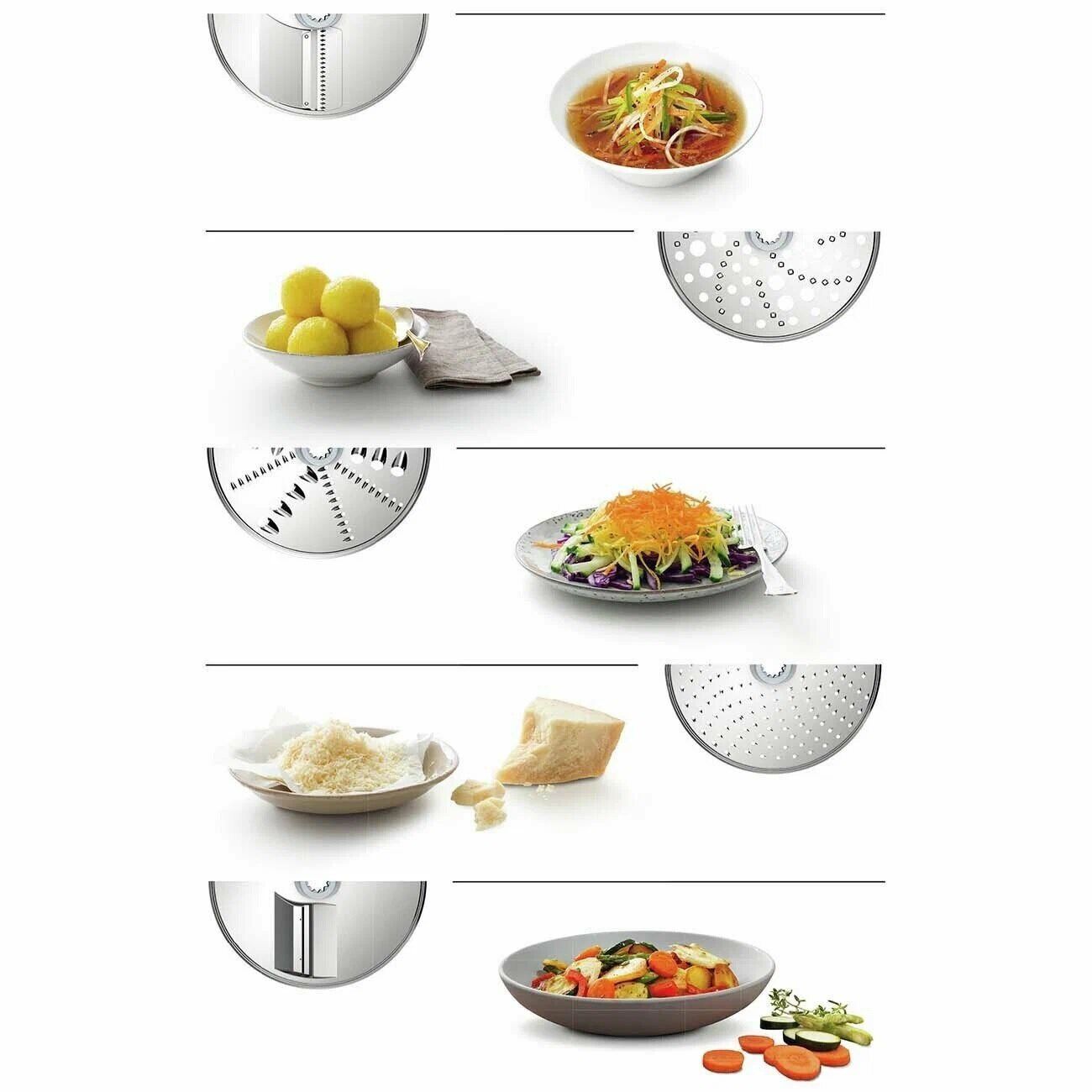 | Комплектация | двусторонний диск-терка /шинковка, диск для нарезки картофеля, диск для нарезки ломтиками, диск для нарезки овощей по-азиатски, прозрачная крышка, средняя терка, толкатель. |