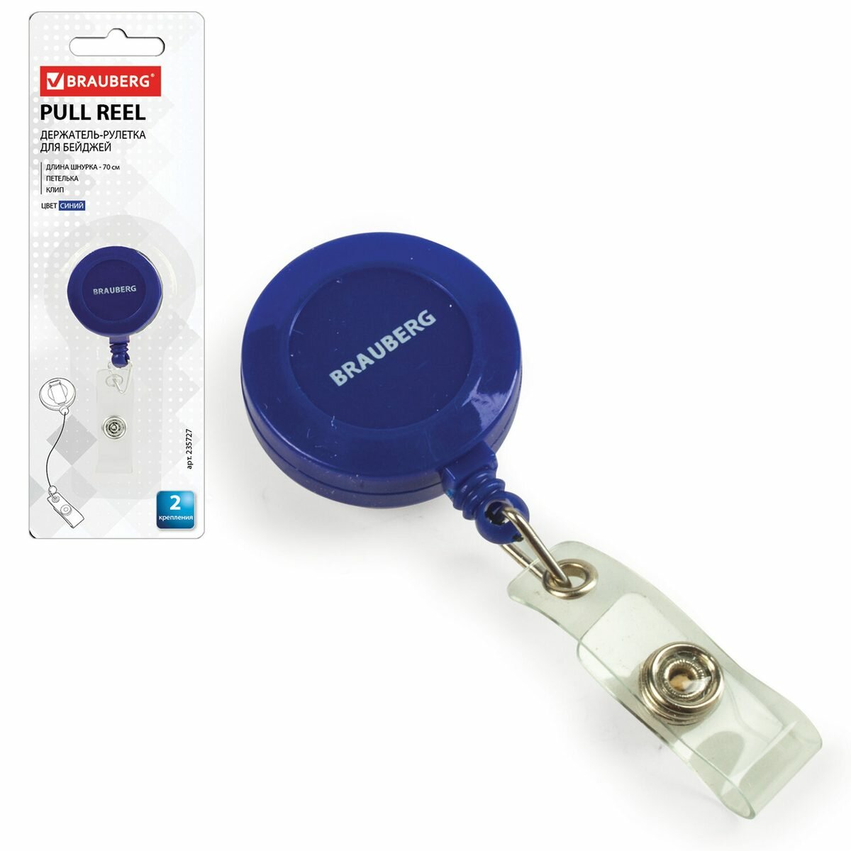 Держатель-рулетка для бейджей Brauberg 70 см, петелька, клип, синий, в блистере (235727)