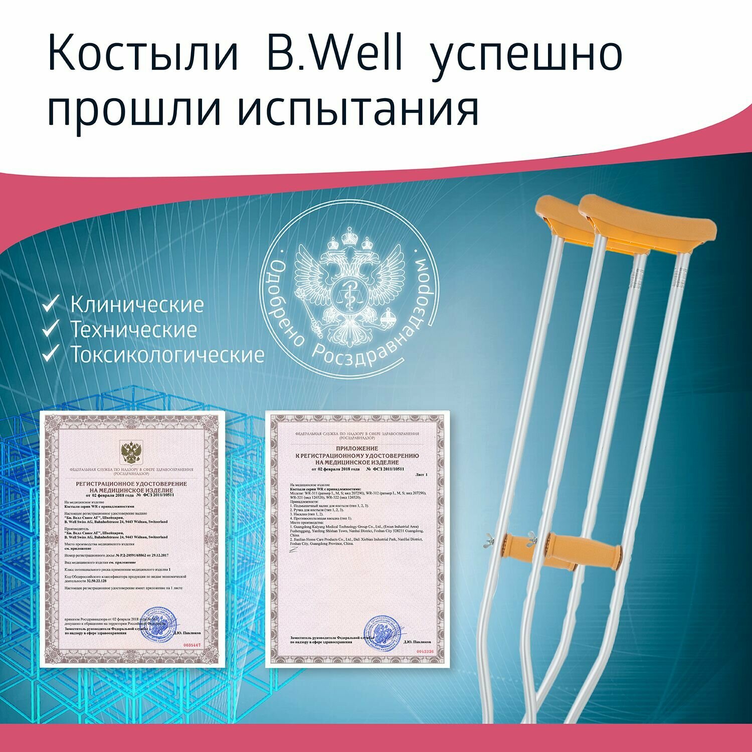 Костыли B.Well rehab WR-311 M, д/роста 155-180 см, алюминиевые, до 110 кг, съемные моющиеся запчасти, 2шт