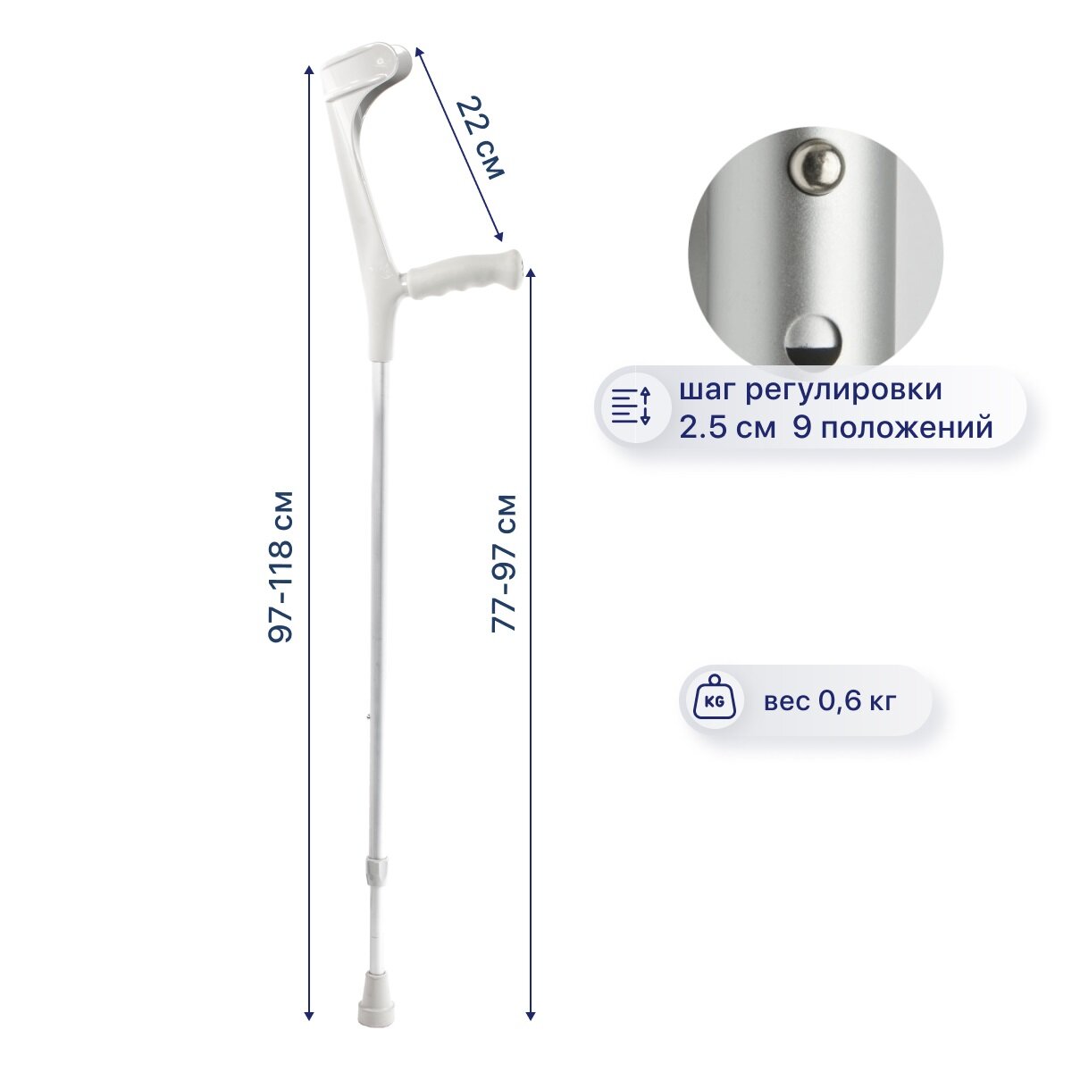 | Дополнительная информация | высота от манжета до ручки - 22 см; высота от ручки до пола - от 77 до 97 см |