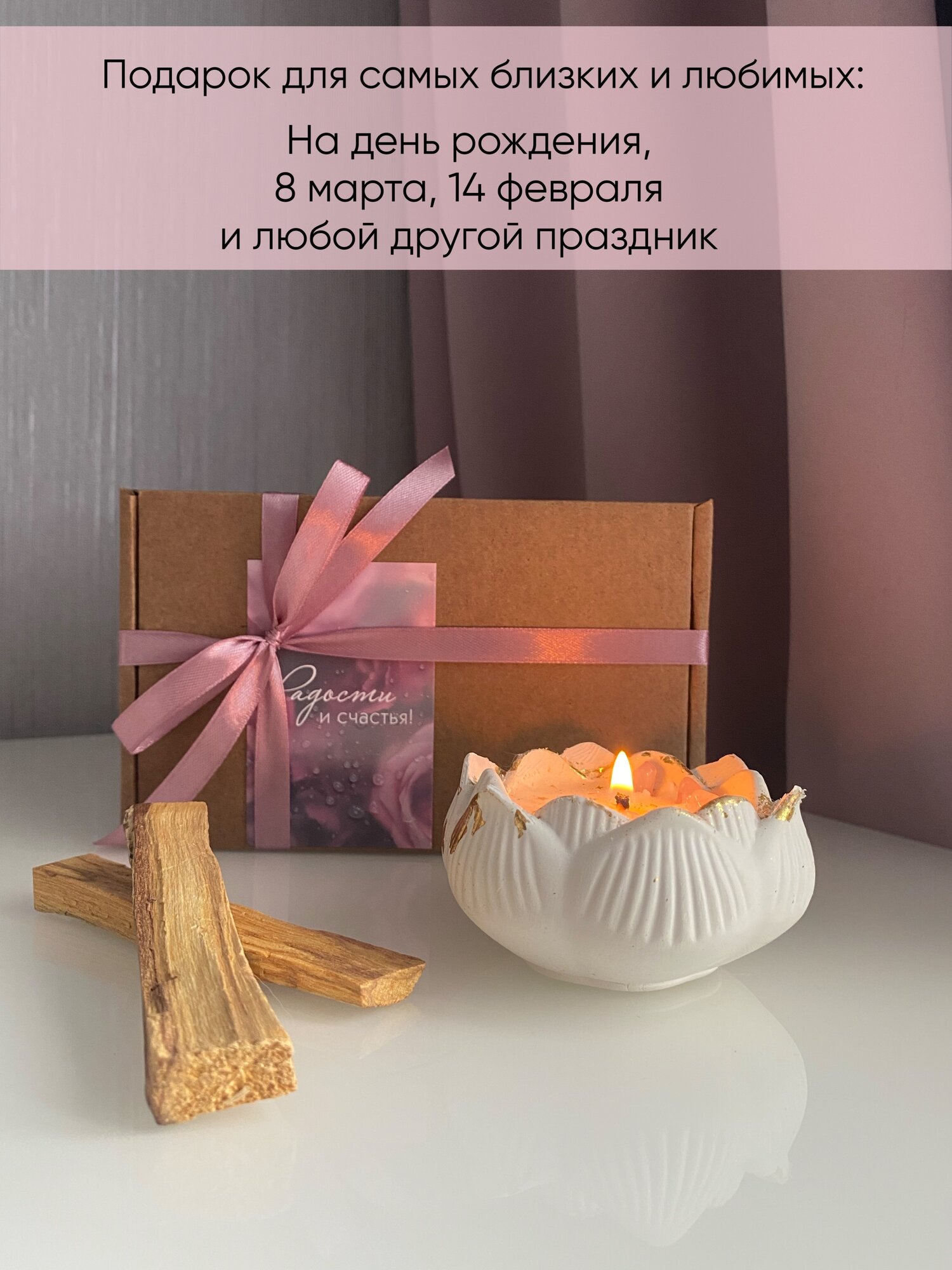 Подарочный набор CocoCandle "Пало Санто", свеча-лотос c розовым кварцем и Пало Санто интересное: