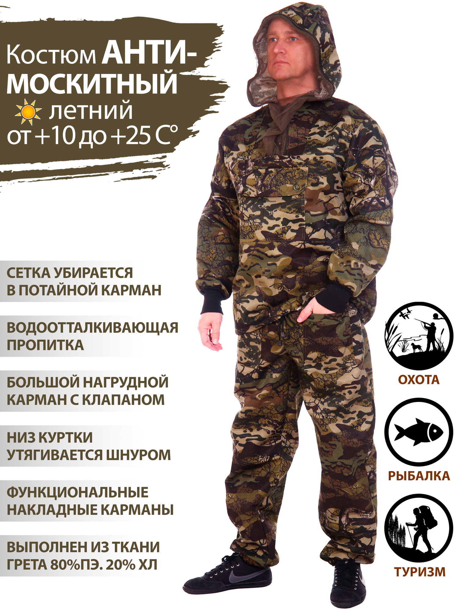 | Защитные свойства | камуфляжный / противомоскитный / противоэнцефалитный |