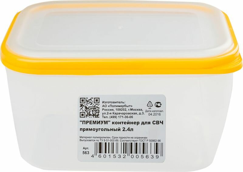 Контейнер для еды, подходит для СВЧ, 2400 мл, премиум, прямоугольный, POLIMERBYT, пластик, цвет в ассортименте