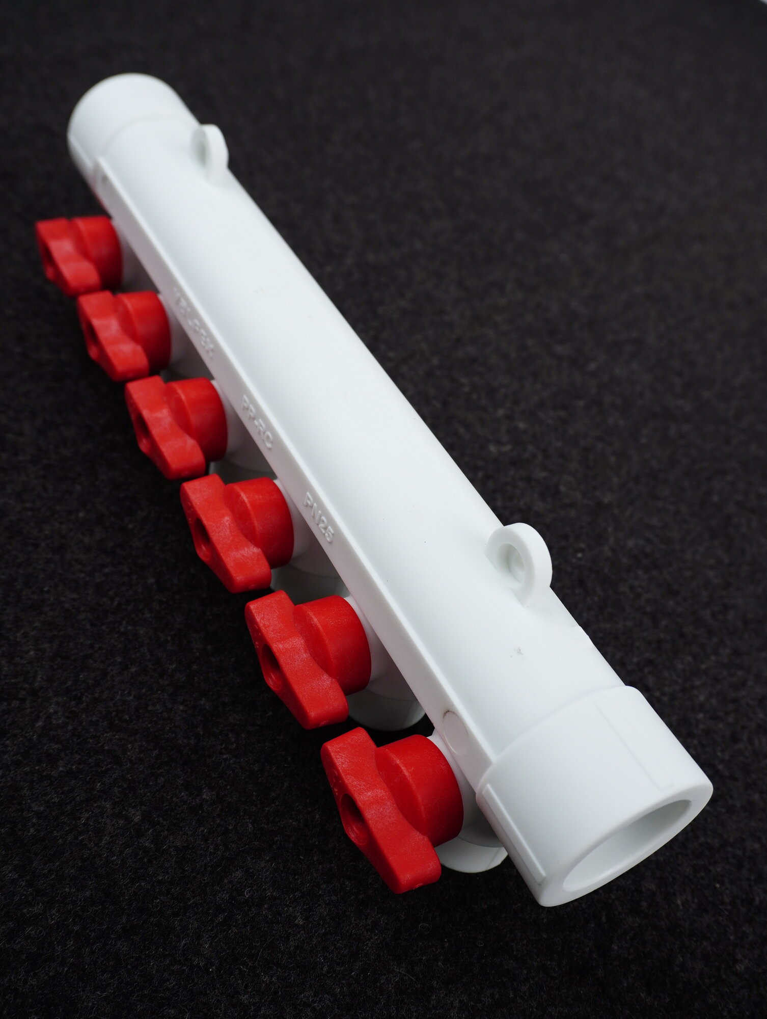Коллектор универсальный 32х20 - 5 выходов полипропиленовый с красными и синими ручками для отсечных кранов Valfex