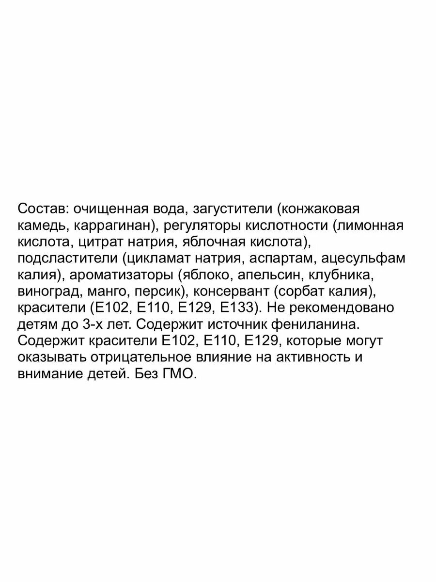 | Состав | очищенная вода, регуляторы кислотности (лимонная кислота, яблочная кислота, цитрат натрия), загуститель (каррагинан), подсластители (аспартам, сукралоза), консервант (сорбат калия), ароматизаторы (клубника, яблоко, апельсин, виноград), красители Е102, Е110, Е129, Е1З3З, Е171. |