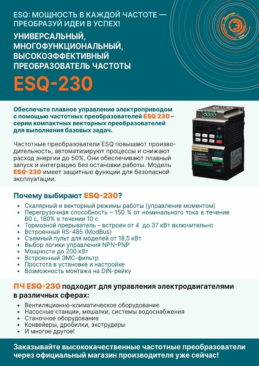 Частотный преобразователь ESQ-230-2S-1.5K 1.5кВт 220В / вх: 1ф x 220В, вых: 3ф х 220В Преобразователь частоты 1,5 кВт интересное: