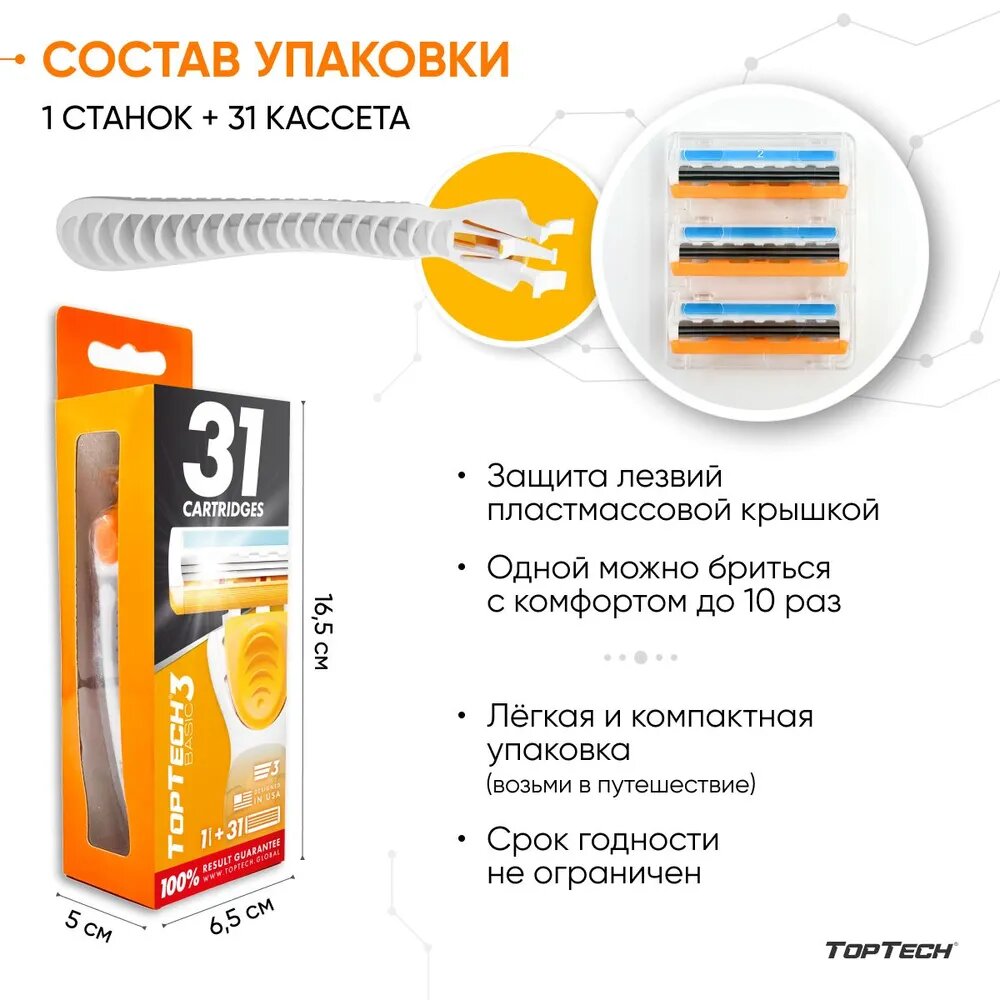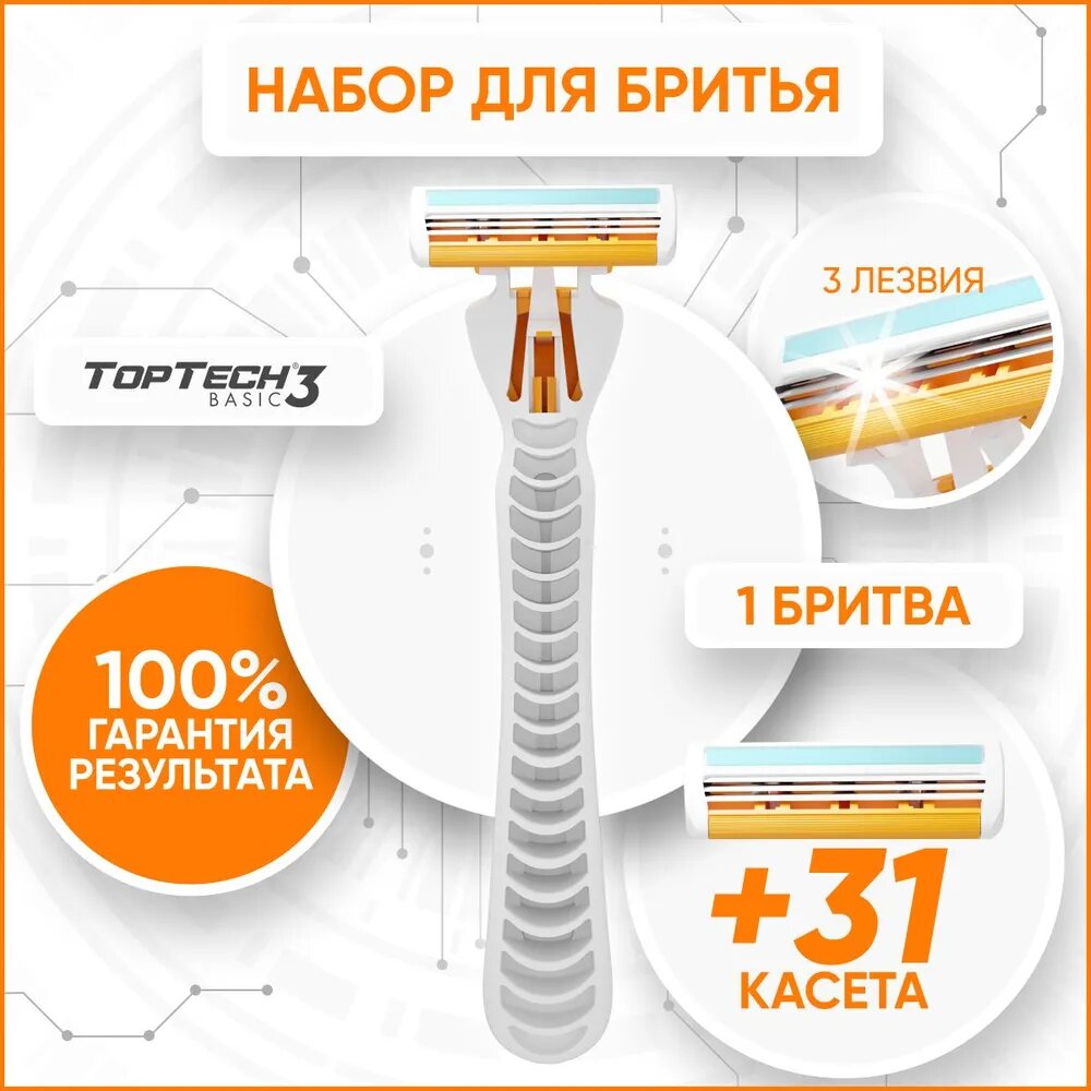 Бритва для мужчин TopTech Basic 3 + сменные кассеты 31 шт, 3 лезвия. Станок для бритья мужской. интересное:
