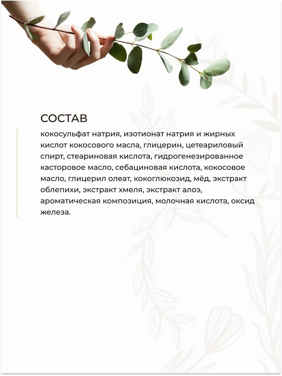 | Состав | кокосульфат натрия, изотионат натрия и жирных кислот кокосового масла, глицерин, цетеариловый спирт, стеариновая кислота, гидрогенезированное касторовое масло, себациновая кислота, кокосовое масло, глиуерил олеат, кокоглюкозид, мёд, экстракт облепихи, экстракт хмеля, экстракт алоэ, ароматическая композиция, молочная кислота, оксид железа |