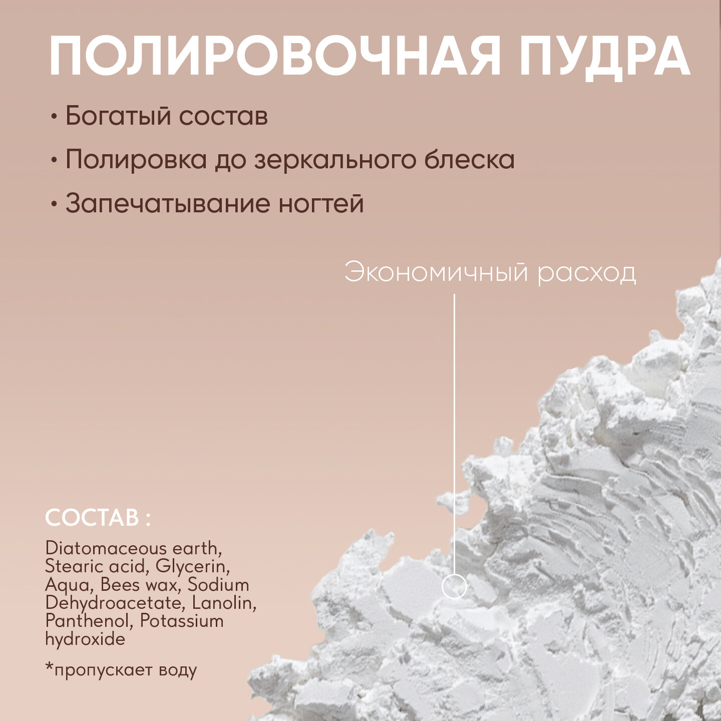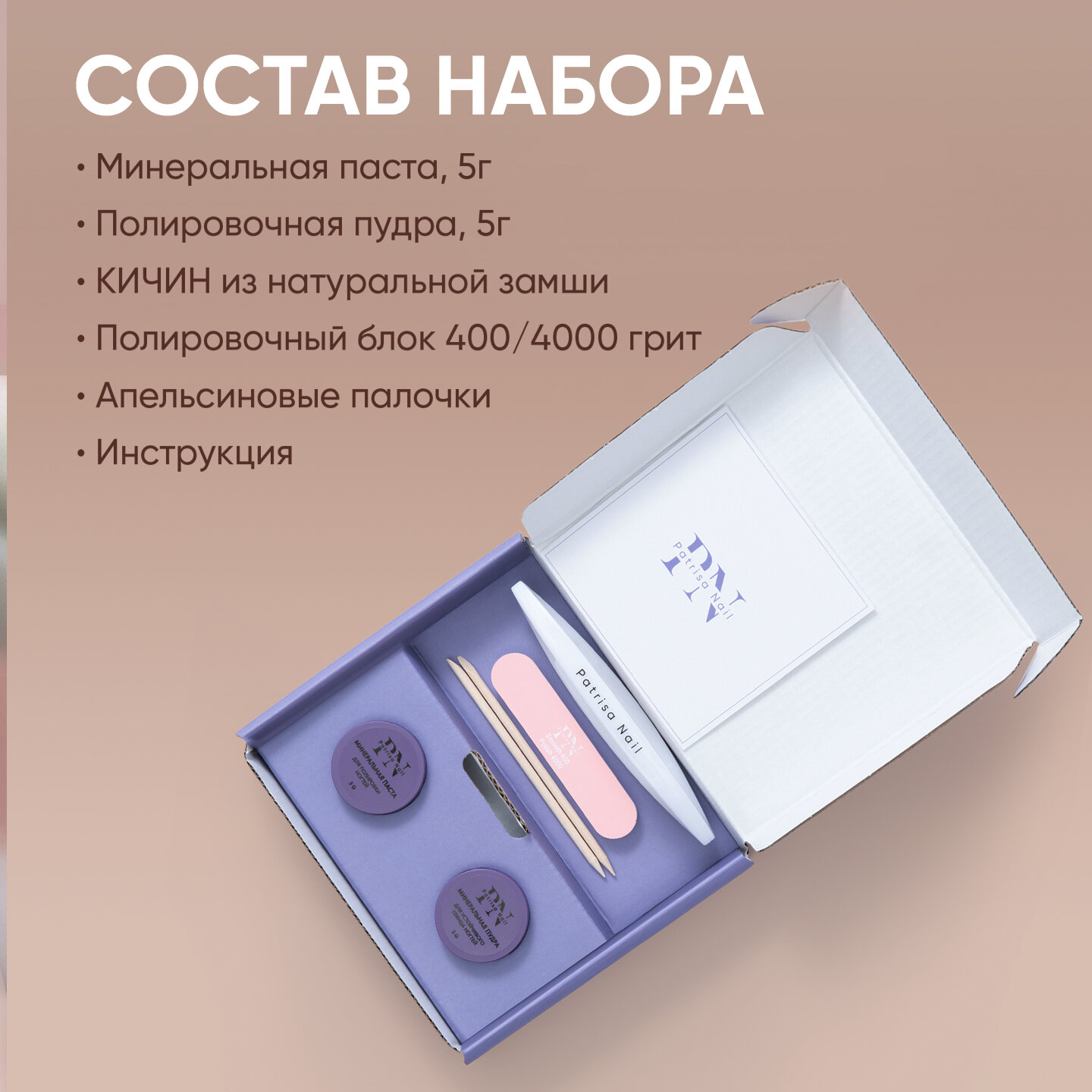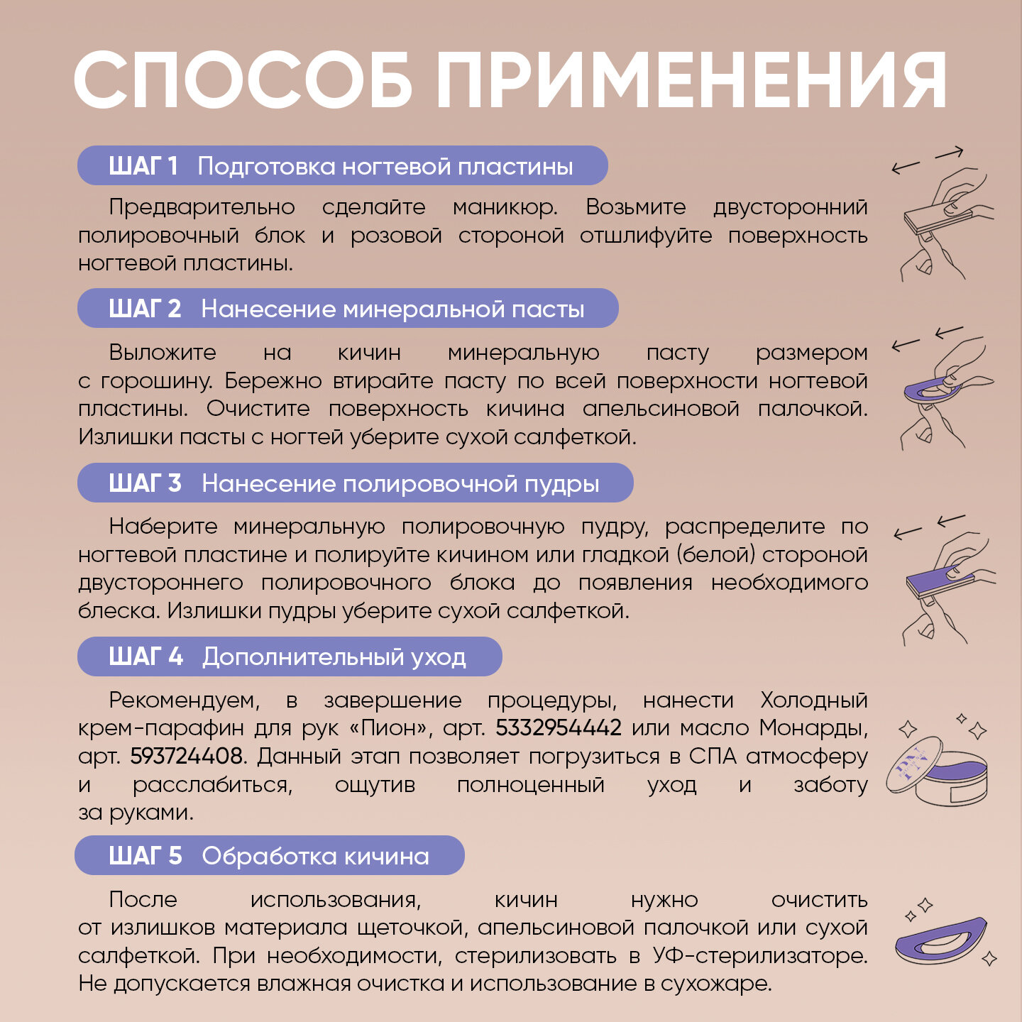 | Способ применения | 1. Предварительно сделайте маникюр, далее возьмите полировочный блок розовой стороной и отшлифуйте поверхность ногтевой пластины. 2. Наберите минеральную пасту размером с горошину и выложите на кичин, бережно втирайте по всей поверхности ногтевой пластины. Уберите остатки пасты. 3. Апельсиновой палочкой наберите минеральную пудру для устойчивого глянца, распределите по ногтю и полируйте поверхность ногтевой пластины гладкой стороной блока до необходимого блеска или используйте кичин, затем удалите остатки пудры. |
