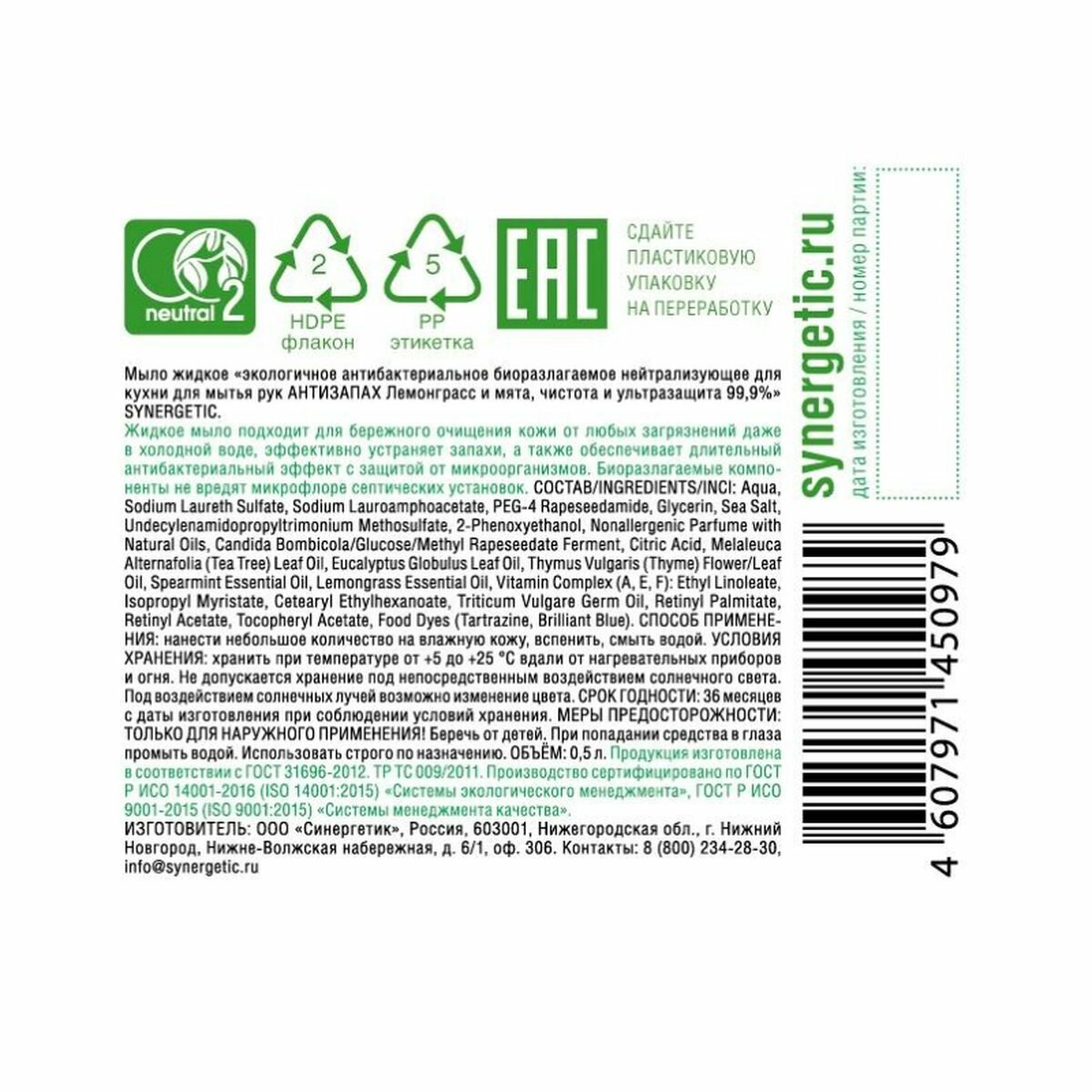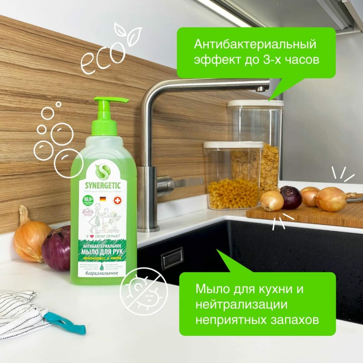 Жидкое мыло для рук Synergetic антибактериальное нейтрализующее запах "Лемонграсс и мята" 500 мл