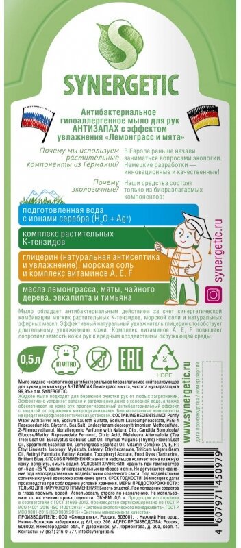 Жидкое мыло для рук Synergetic антибактериальное нейтрализующее запах "Лемонграсс и мята" 500 мл