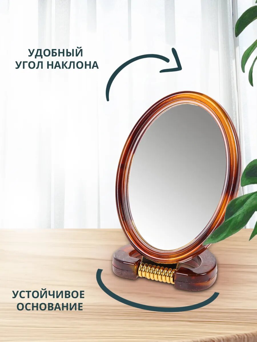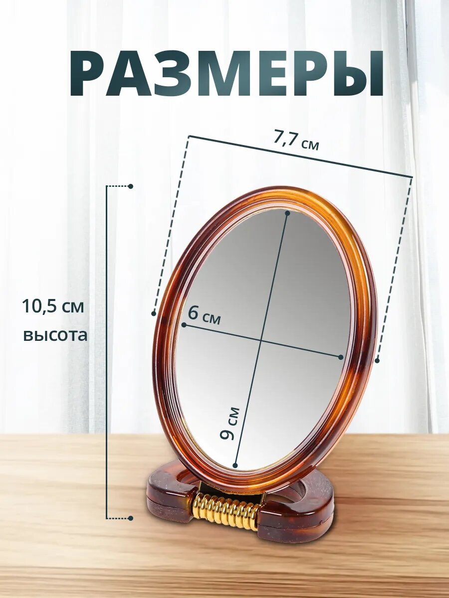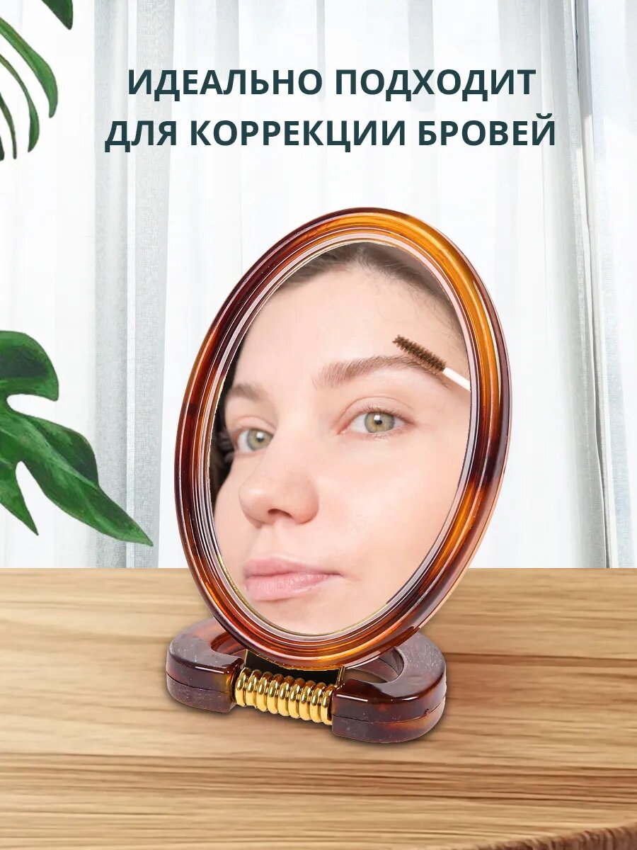 Зеркало косметическое двухстороннее, настольное, овальное 10 см, пластик, коричневый