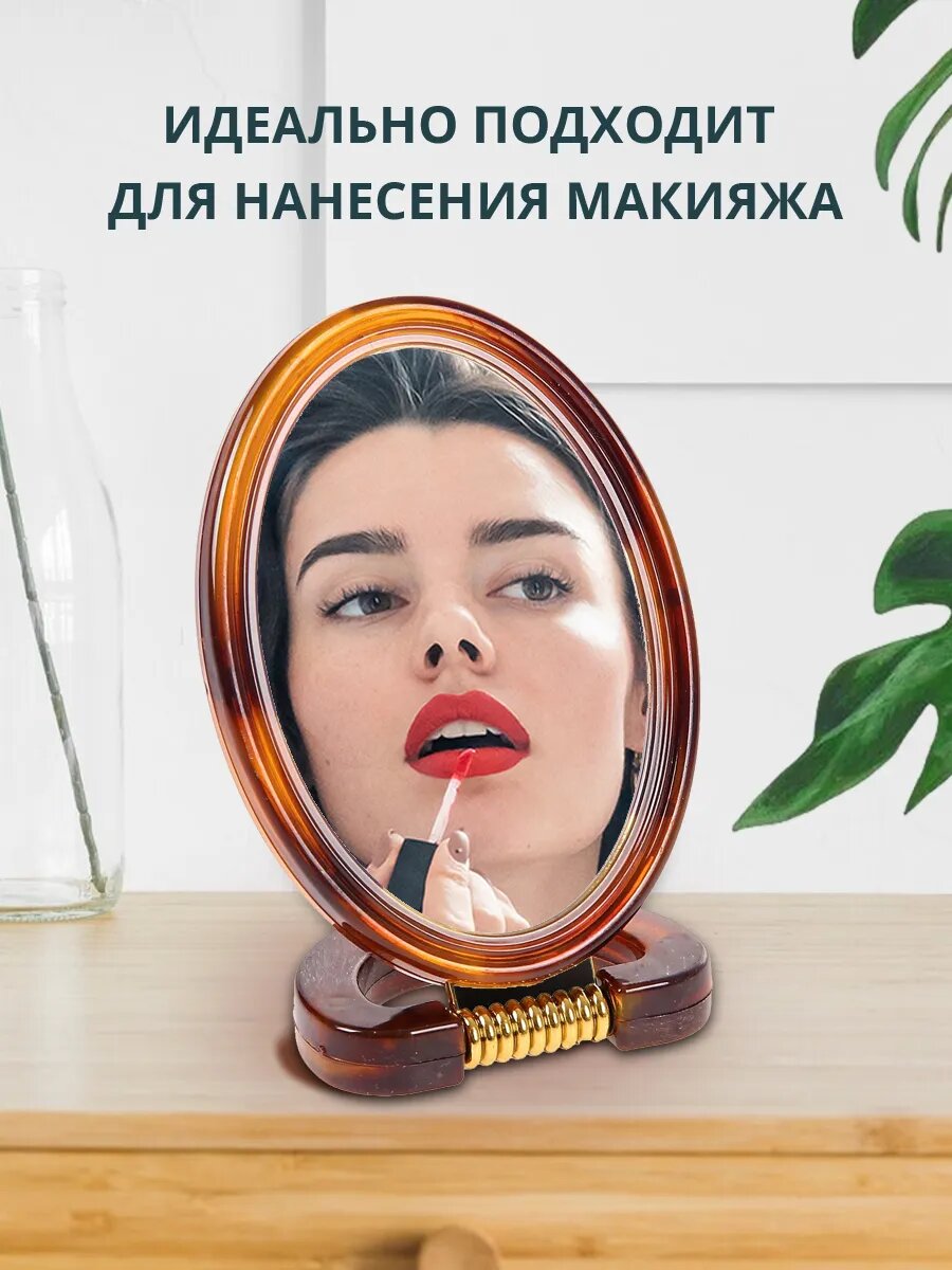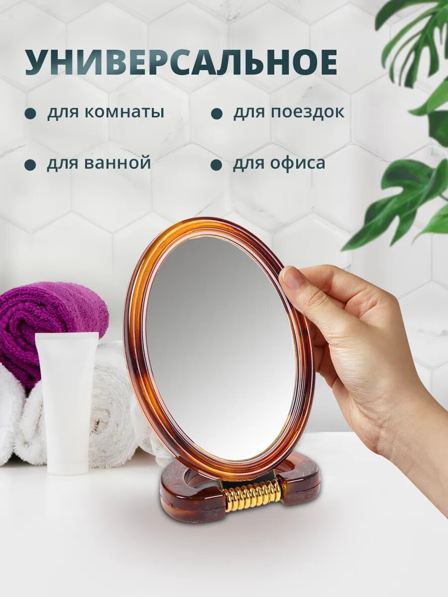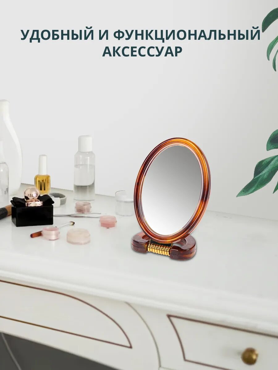 Зеркало косметическое двухстороннее, настольное, овальное 10 см, пластик, коричневый