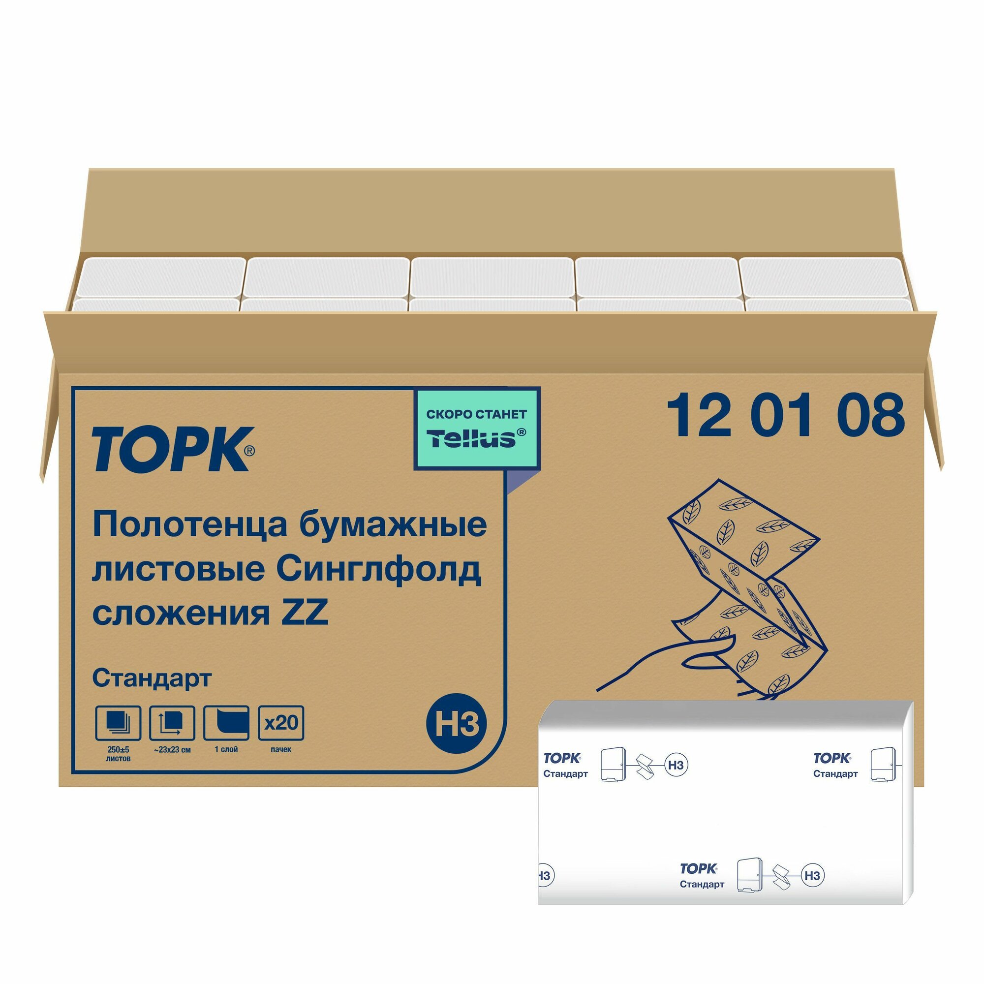 Полотенца бумажные Tork Singlefold, Universal, система H3, 250 листов, лист 23Х23 см, 1 сл., белые, 20 пачек (арт: 120108)