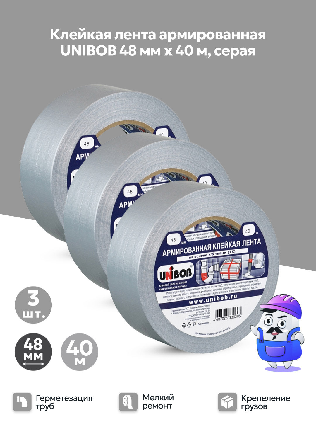 Купить Набор клейкая лента армированная UNIBOB 48мм х 40м серая (3шт)