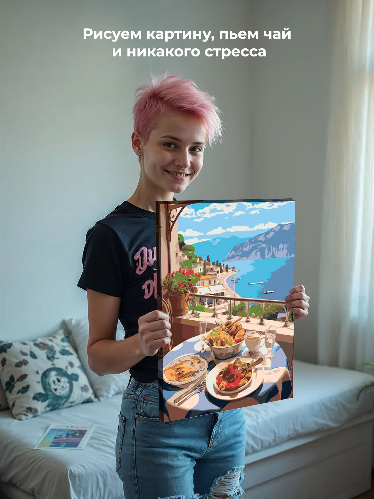 Купить Картина по номерам на холсте с подрамником "Природа: Вид из кафе на море в куротном городе", Раскраска 40х50 см, Заливы