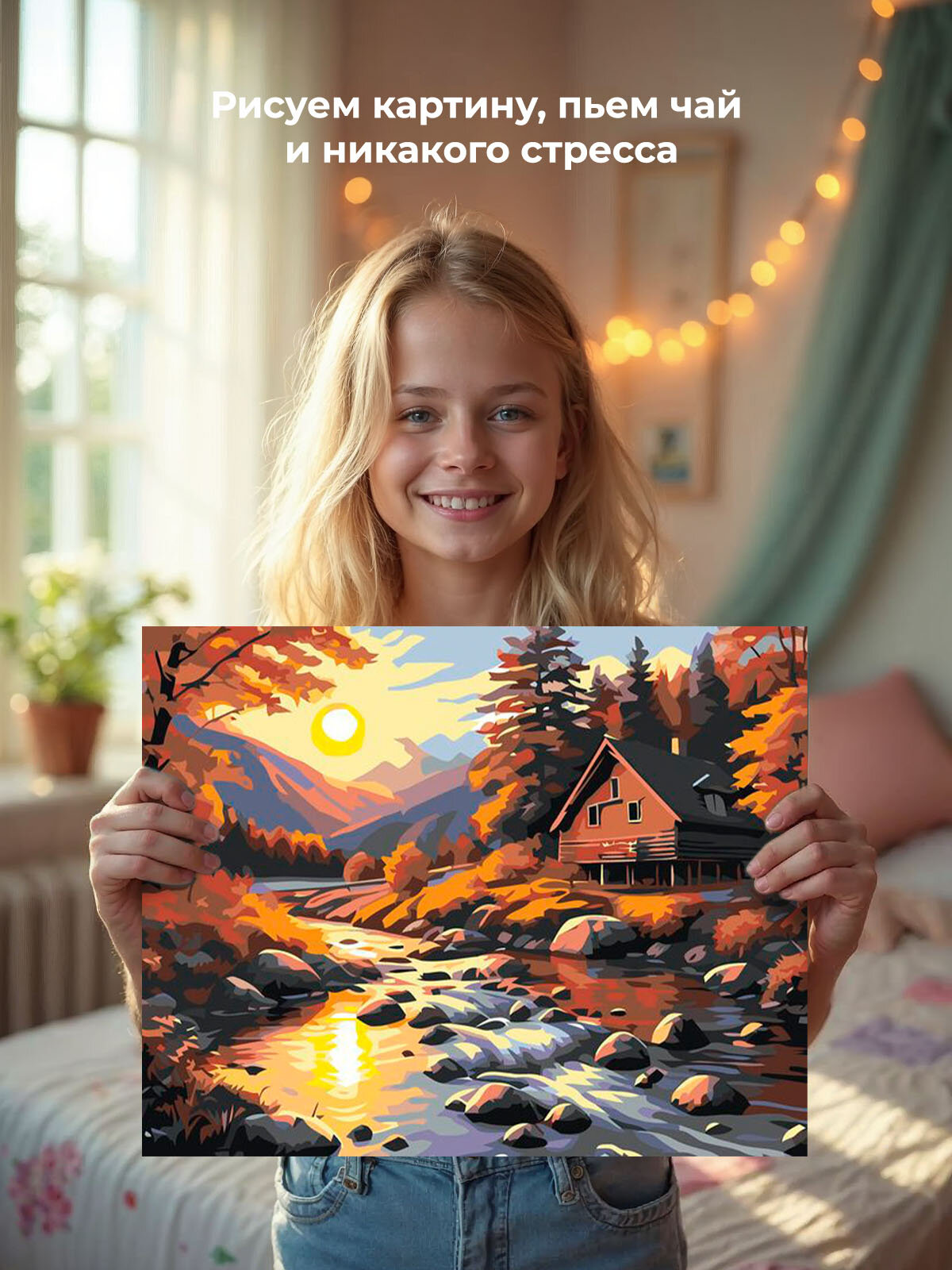 СохранитьКартина по номерам на холсте с подрамником "Природа: Пейзаж с домиком у ручья на закате", Раскраска 40х50 см, Лес Осень интересное: