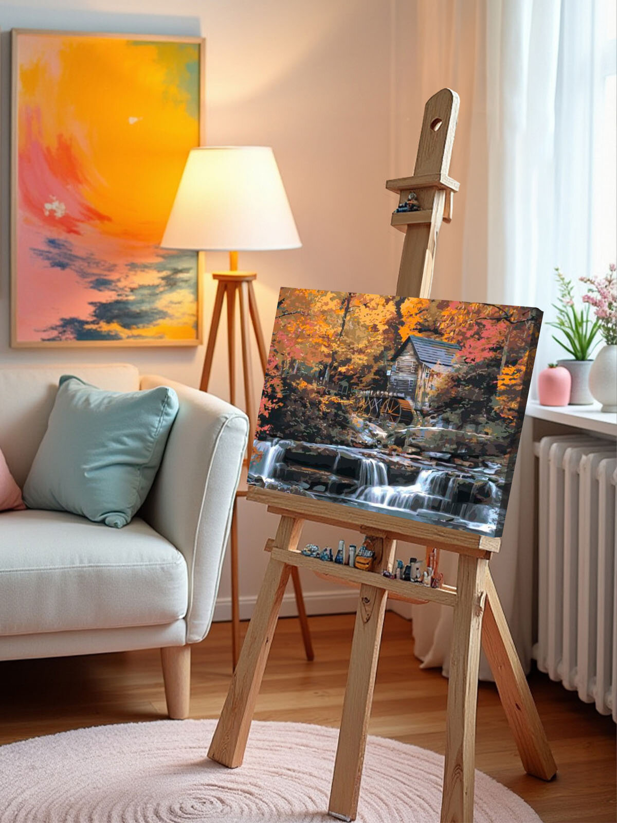СохранитьКартина по номерам на холсте с подрамником "Природа: Пейзаж с водяной мельницей на ручье в осеннем лесу", Раскраска интересное:
