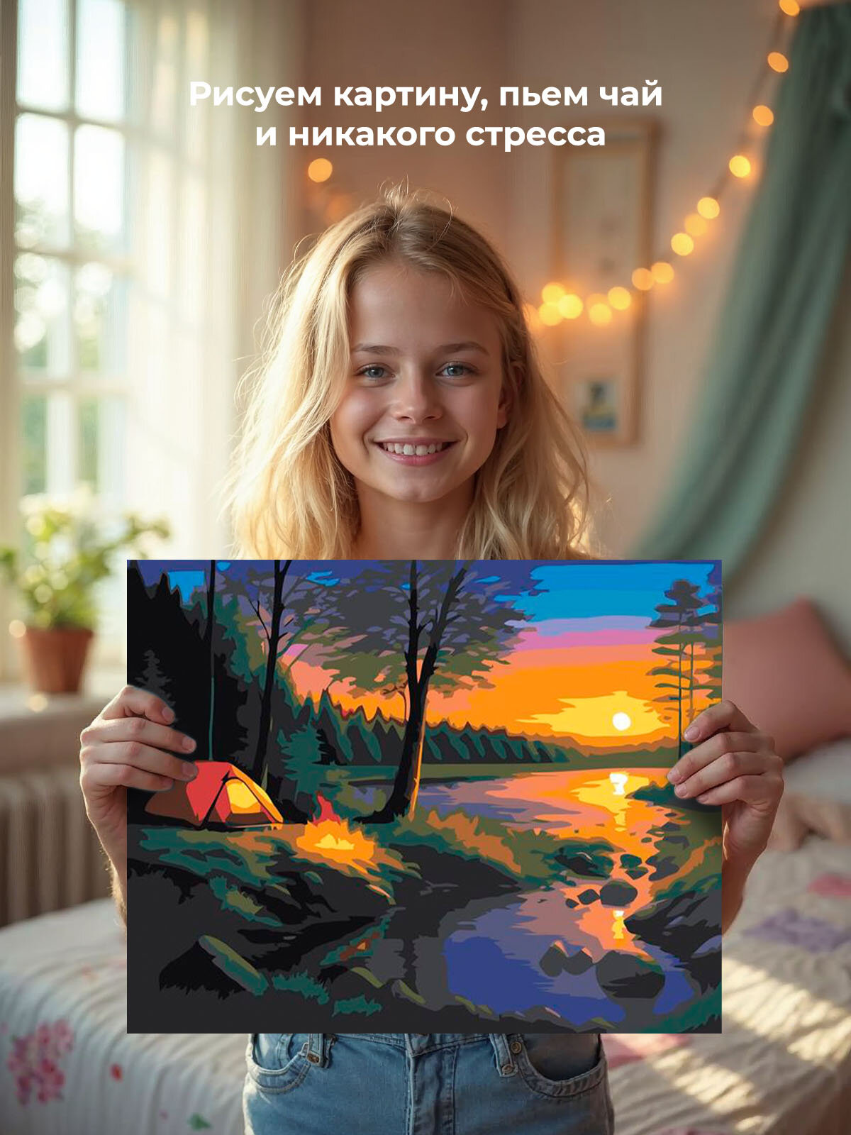 СохранитьКартина по номерам на холсте с подрамником "Природа: Пейзаж с палаткой и костром в лесу на закате", Раскраска 40х50 см интересное: