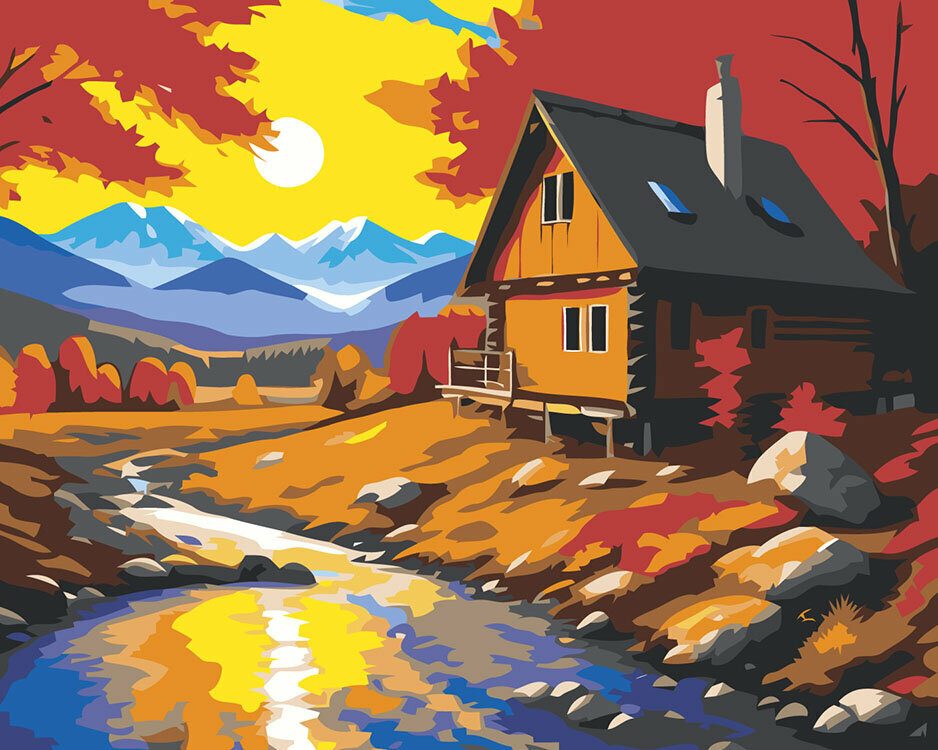 Картина по номерам Природа пейзаж с домом у ручья на закате