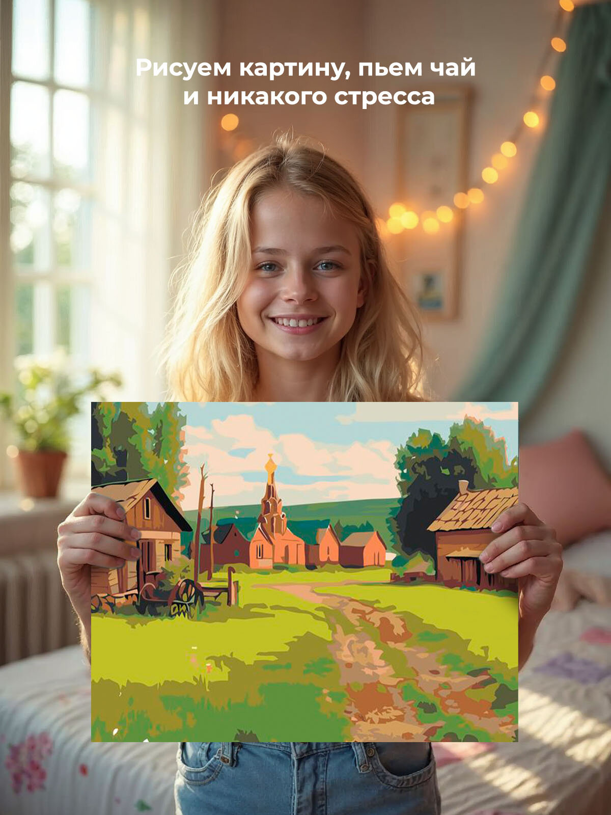 Картина по номерам на холсте с подрамником "Природа: Деревенский пейзаж с церковью", Раскраска 40х50 см, Лето День