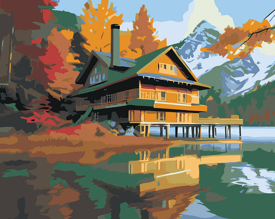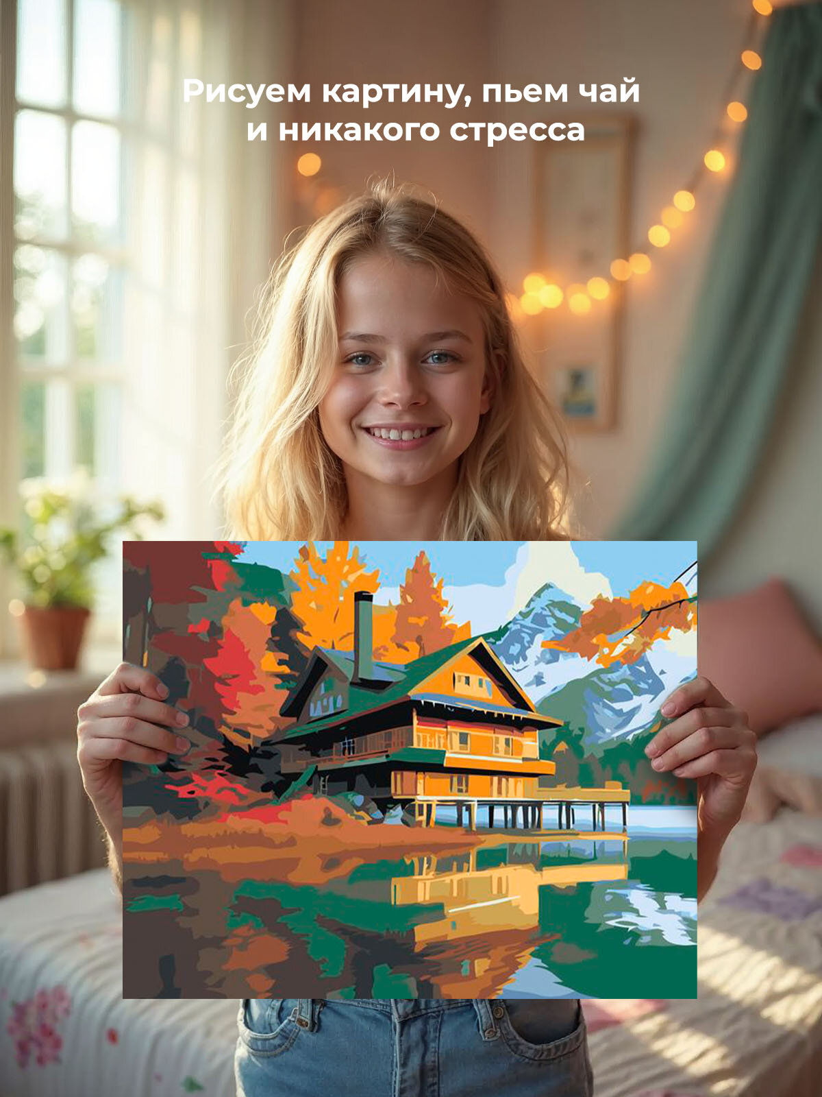 СохранитьКартина по номерам на холсте с подрамником "Природа: Пейзаж с домом на озере с видом на горы 2", Раскраска 40х50 см интересное: