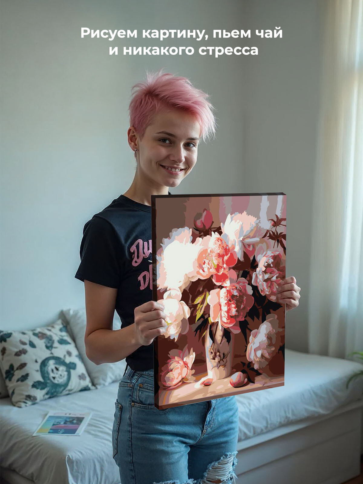 Картина по номерам на холсте с подрамником "Цветы: Девушка и пионы в пастельных тонах" Раскраска 40x50 см, Растения