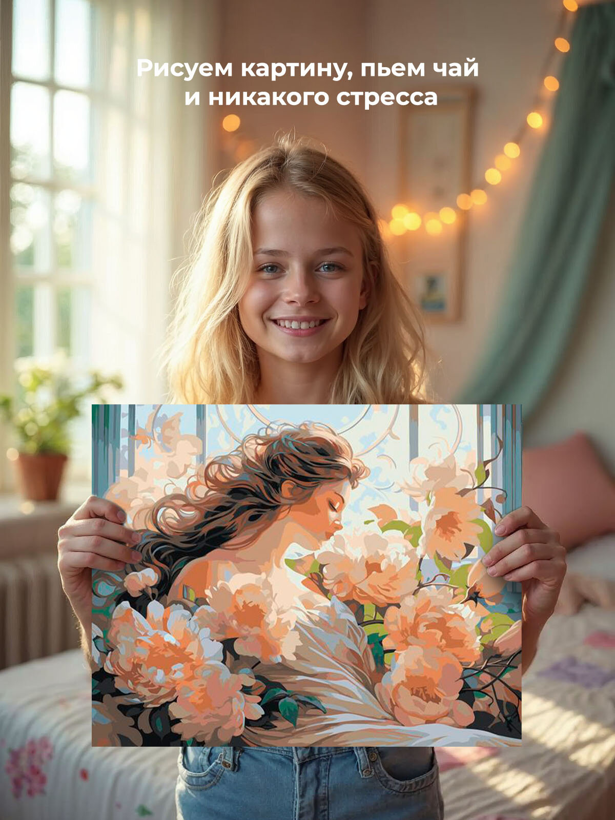 Картина по номерам на холсте с подрамником "Цветы: Девушка и пионы в пастельных тонах" Раскраска 40x50 см, Растения