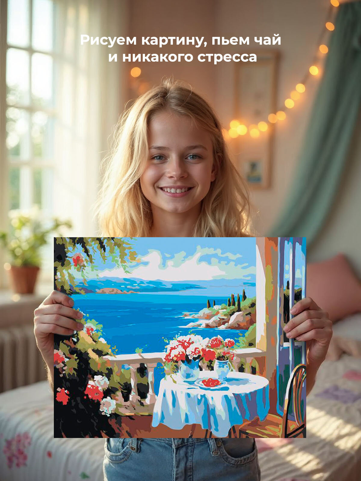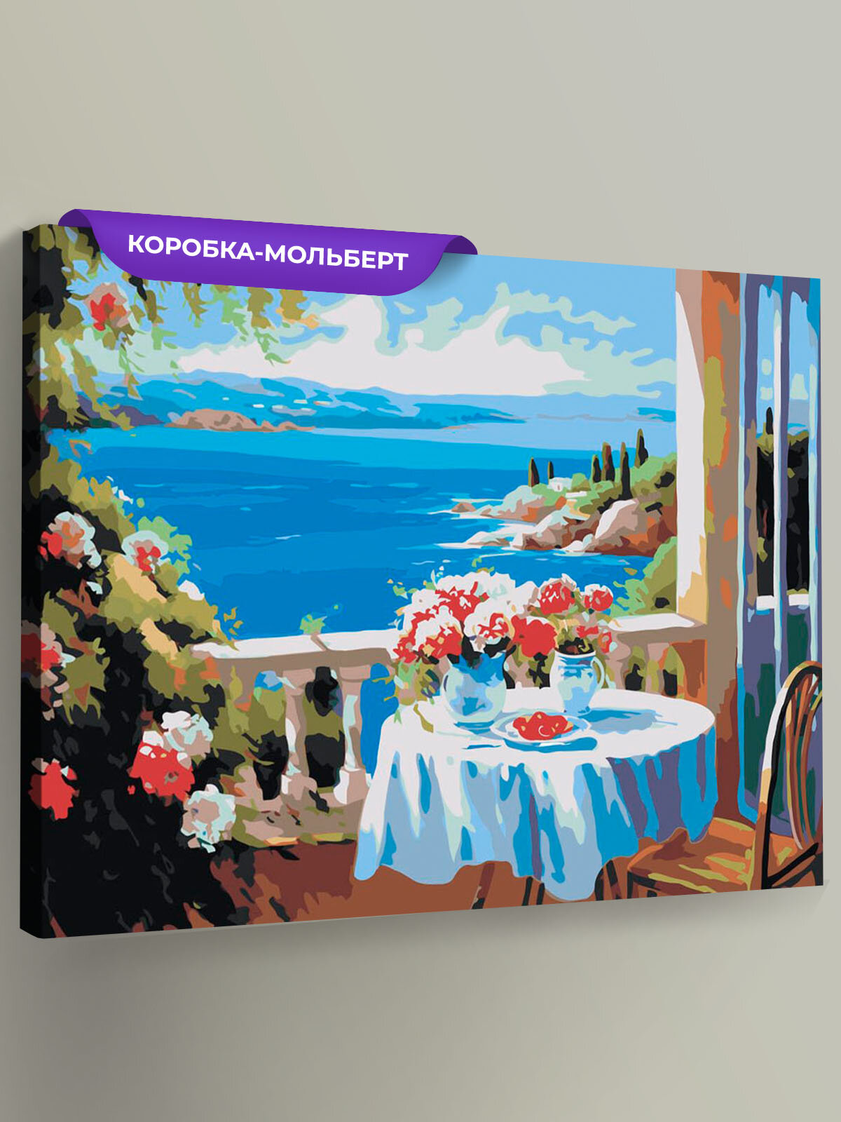 СохранитьКартина по номерам на холсте с подрамником "Море: Веранда с цветами и видом на залив" Раскраска 40x50 см, Террасы интересное: