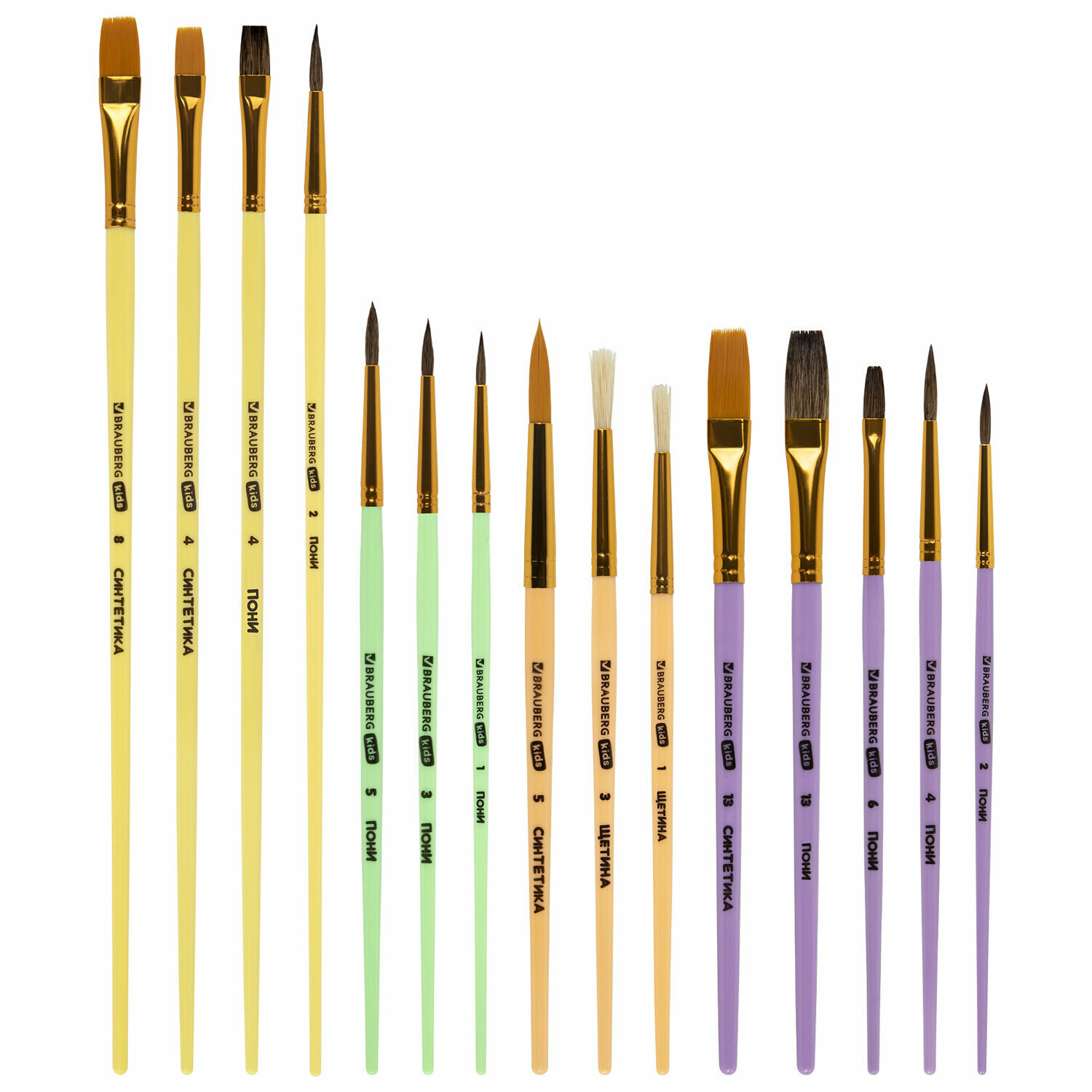 Кисти для рисования в школу набор 15 штук (пони – 9 шт., синтетика – 4 шт., щетина – 2 шт.), кисточки круглые и плоские, синтетика, щетина, пони, Brauberg Kids, 201081