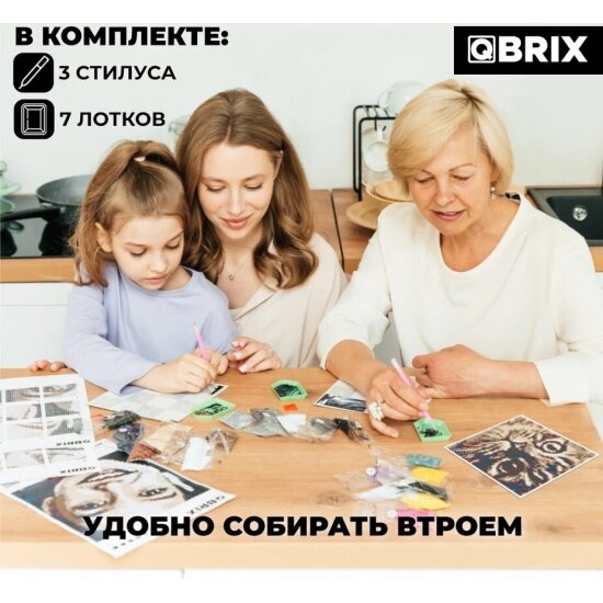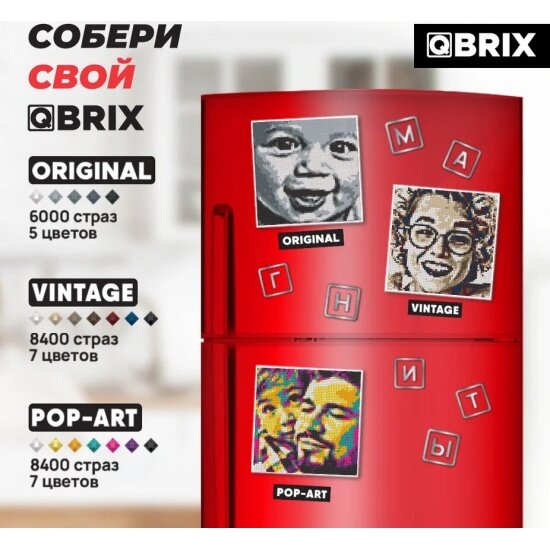 | Дополнительная информация | С чего начать? 1. Покупаете набор алмазной мозаики на подрамнике А3 от QBRIX; 2. Заходите на официальный сайт производителя в раздел «Алмазная фото-мозаика»; 3. Вводите индивидуальный код и загружаете желаемую фотографию; 4. Выбираете понравившийся вариант сборки; 5. Получаете инструкцию и приступаете к созданию картины. |