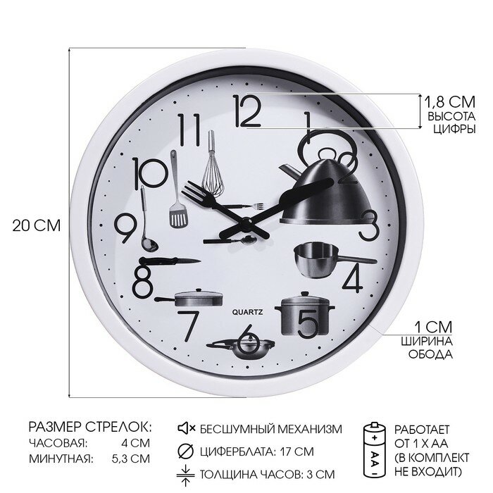 Ниже Вы можете прочитать отзывы на Часы настенные, для кухни, "Кухонные приборы", плавный ход, d-20 см, ознакомится с подробными характеристиками, посмотреть интересные обзоры и фотографии на Часы настенные, для кухни, "Кухонные приборы", плавный ход, d-20 см.
