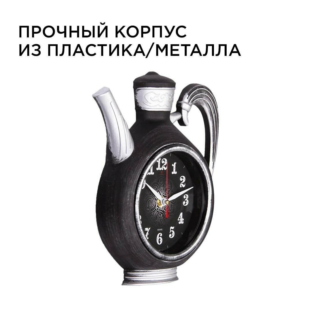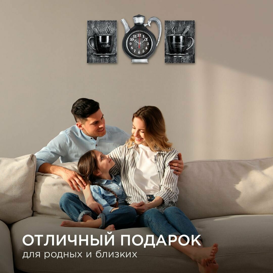 СохранитьЧасы настенные комплект Рубин Чайник + 2 чашки черный с серебром для кухни с плавным ходом арабскими цифрами корпус пластик металл минеральное стекло работа от пальчиковой батарейки АА ширина 53 см интересное: