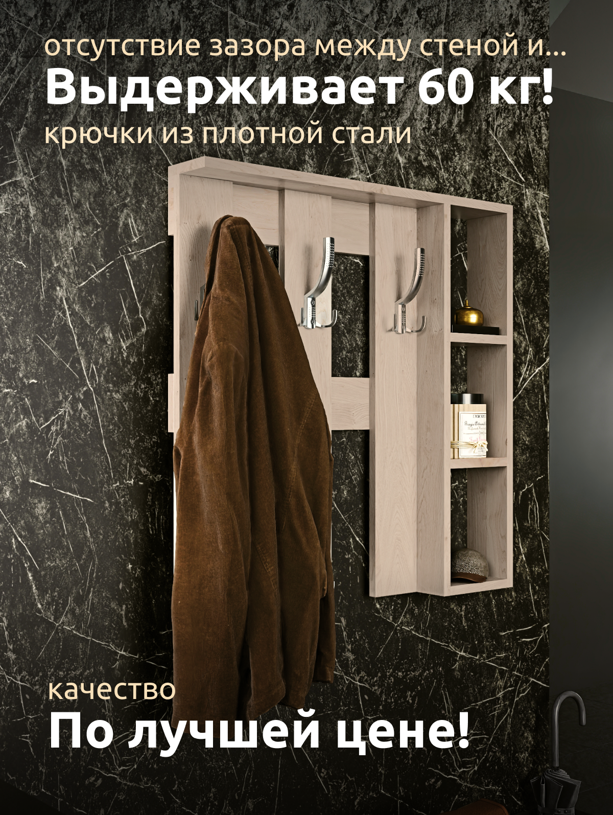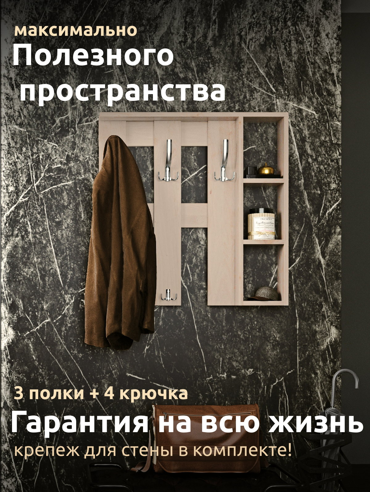 Вешалка настенная деревянная с полками в прихожую для одежды цвет бежевый 80х20х50 см