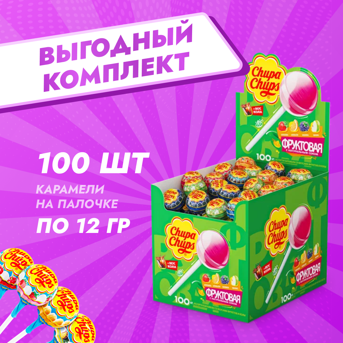 Купить Chupa Chups Карамель на палочке Фруктовая + кола ассорти 12 г х 100 шт