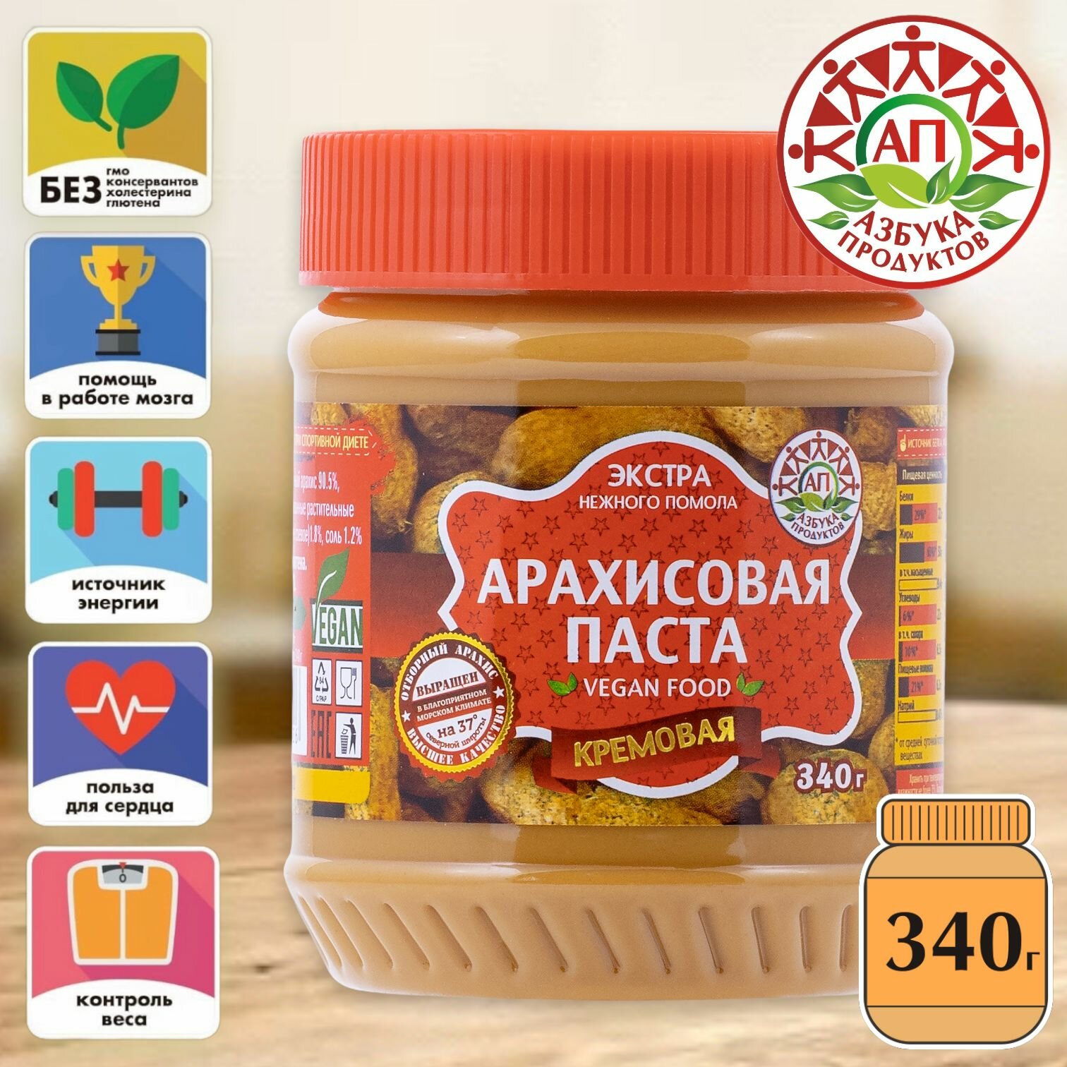 Арахисовая паста Азбука продуктов Экстра, кремовая, 100% натурально, без глютена, 340г интересное: