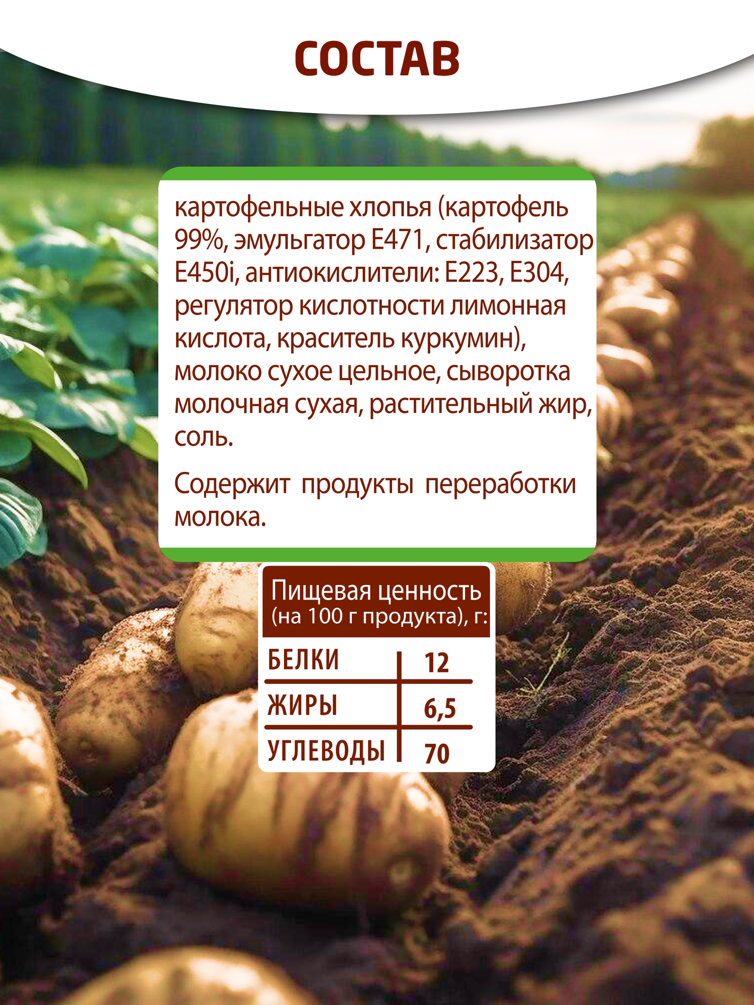 | Состав | растительные жиры, соль, сухая молочная сыворотка, молоко цельное сухое, картофельные хлопья, молоко сухое обезжиренное |