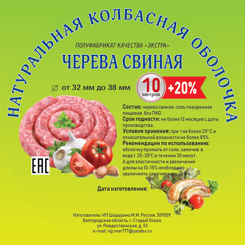 Черева свиная 10м (натуральная оболочка для домашних колбасок, некалиброванная, диаметр от 32 до 38мм) интересное: