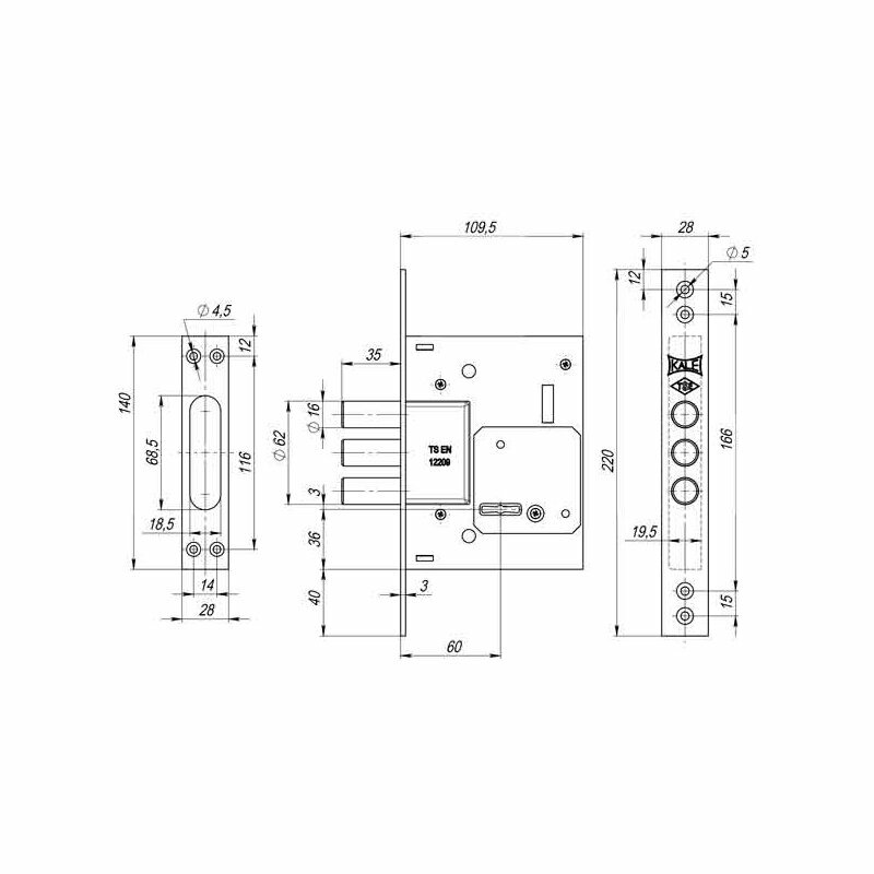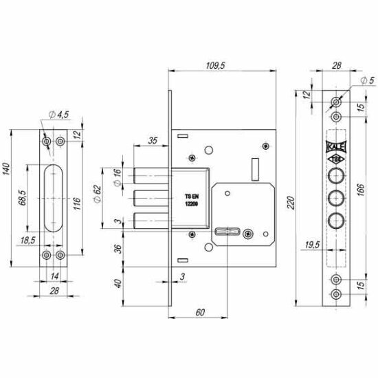 Замок врезной сувальдный Kale Kilit 257/L (тех. упаковка), 5 кл. (кл. 60 мм)